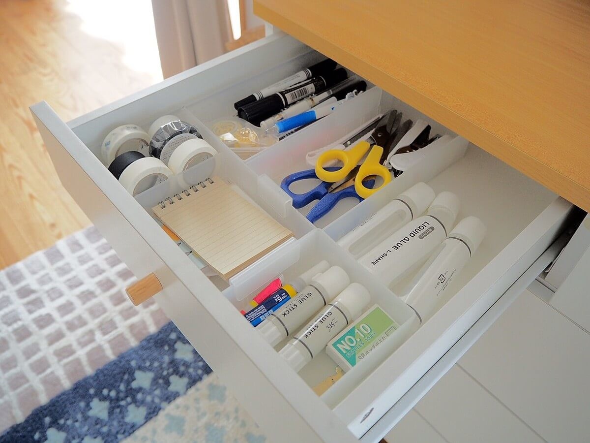 引き出しに収納することで、文具類にありがちな”ごちゃっと感”も見えなくなりましたし、常に決まった場所に収納するようになったので、家族みんなが片付けやすくもなりました。