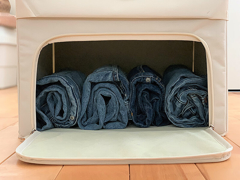 デニム好きな人は、デニムをくるくるっと丸めて収納すれば、デニム専用の定位置が完成!