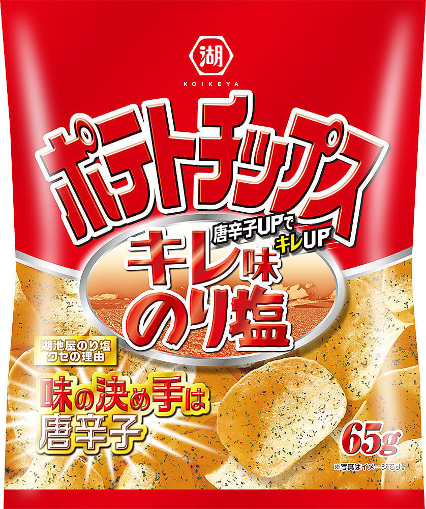 「のり塩」のおいしさを構成する要素の一つである“唐辛子”に着目し、通常の「のり塩」よりも“唐辛子”をきかせたことで、辛味が「のり塩」の味わいをより引き立てる「ポテトチップス キレ味のり塩」が完成しました。