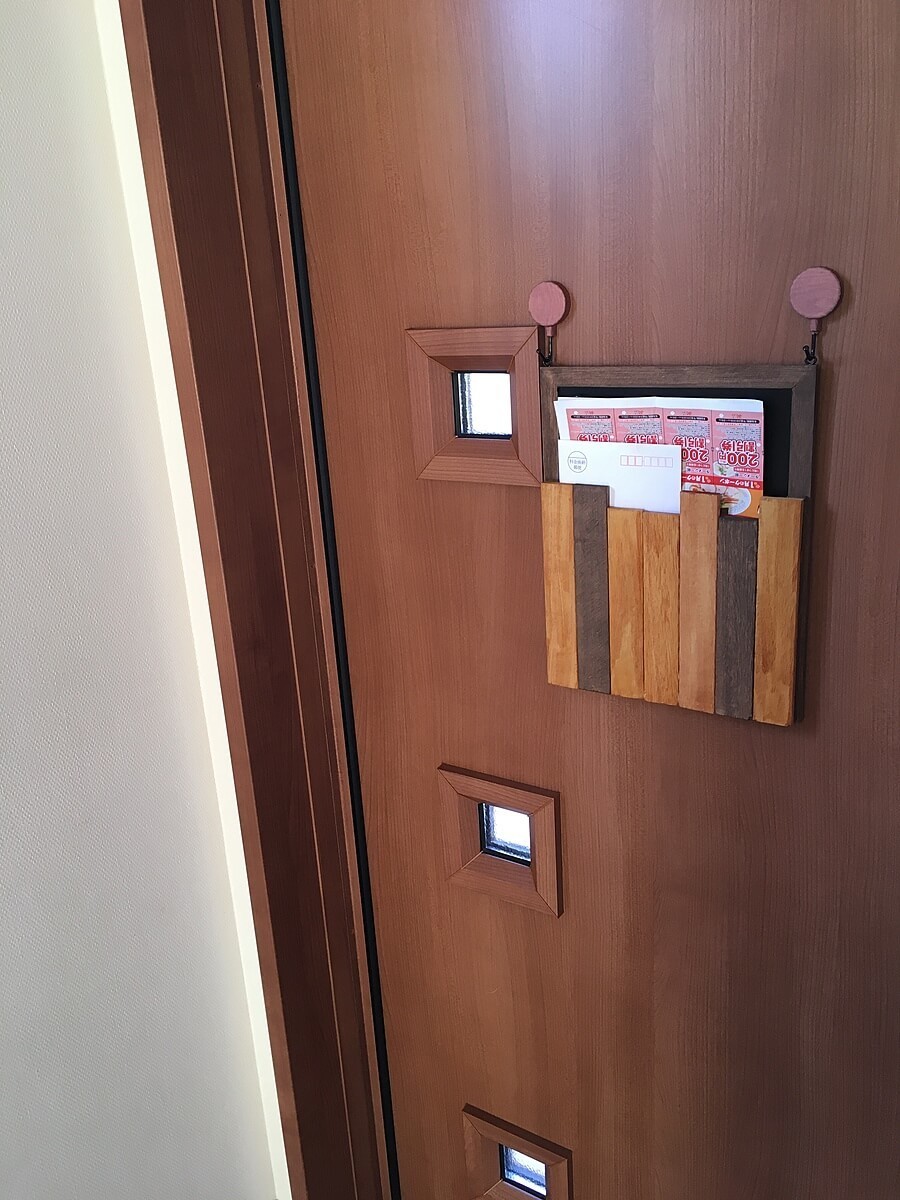 ダイソーのすのこを一度解体し、お便りボードを開閉する扉に作り直しました。とてもおしゃれな扉ですね。