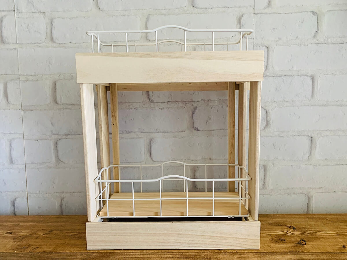 わずか15分で完成したそうです。雑貨屋さんのようなおしゃれなシェルフには調味料や植物を飾っても可愛らしくなります。