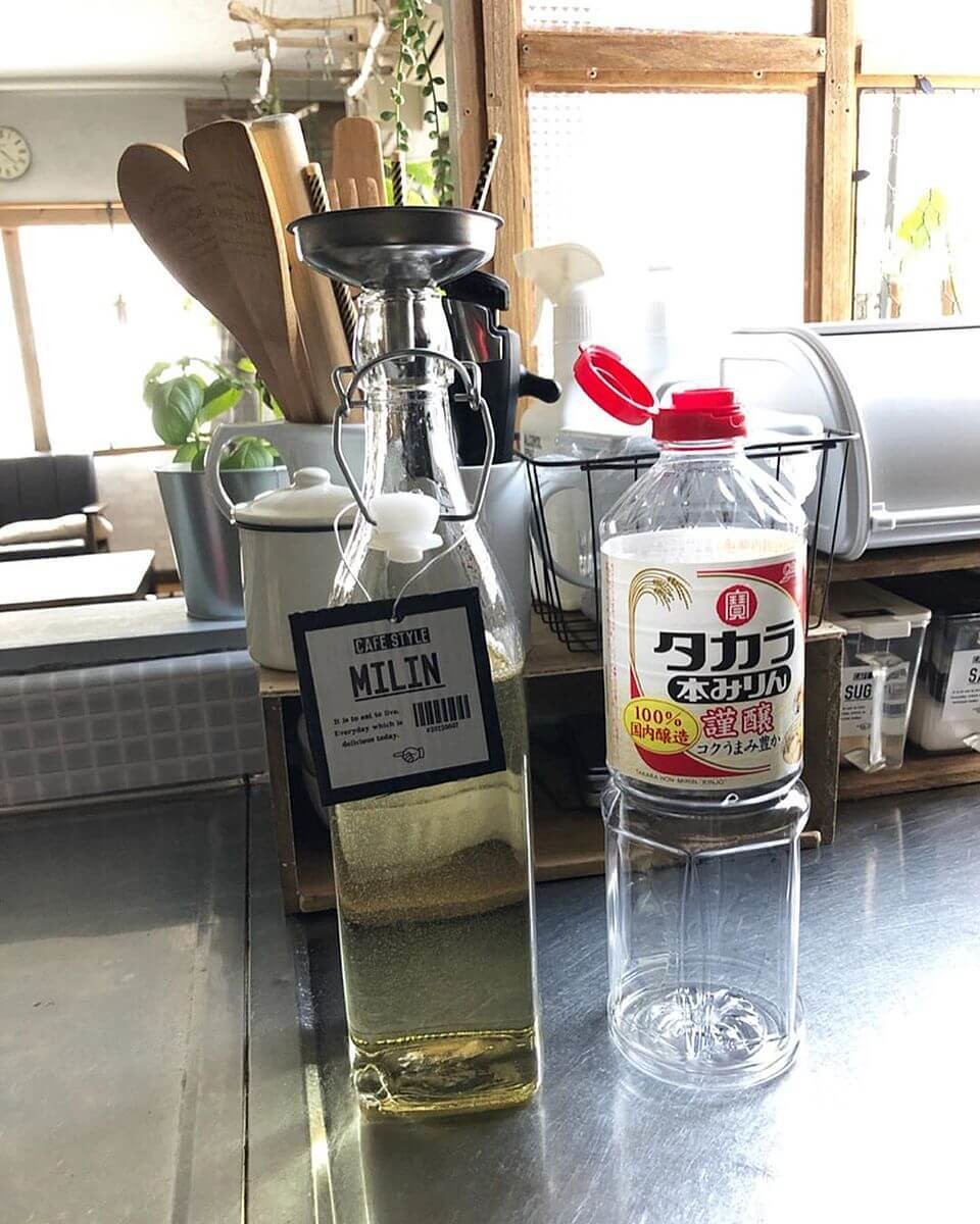 ダイソーのウォーターボトルに液体調味料を収納。1Lちょうど入るそうですよ。ボトルはキャンドゥのボックスに入れて、取り出しやすくしているそうです。