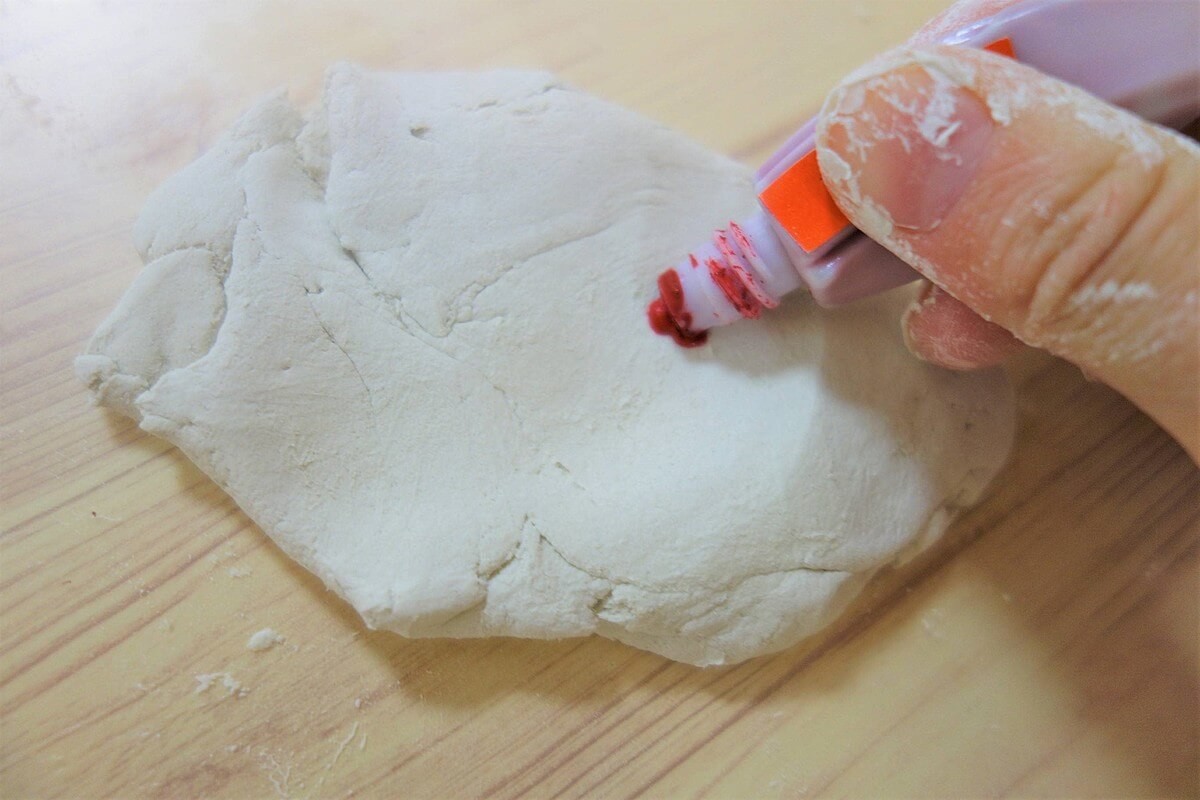 次に、水彩絵の具を少量出してねんどに混ぜ込み、好みの色に着色します。