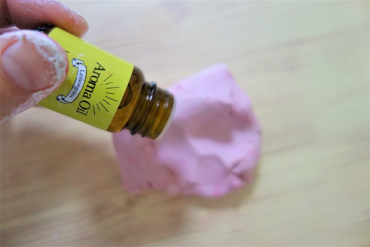 着色が終わったら、好みのアロマオイルを数滴垂らしてねんどに混ぜ込みます。