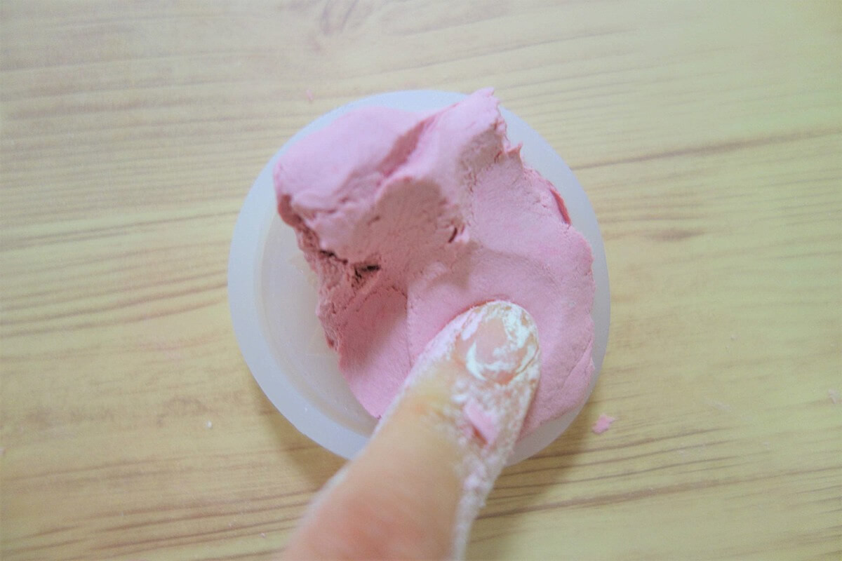 香りがついたら、ねんどが乾かないうちにシリコンモールドでねんどを型取ります。ねんどは空気が入らないようにぎゅっと詰め込みます。