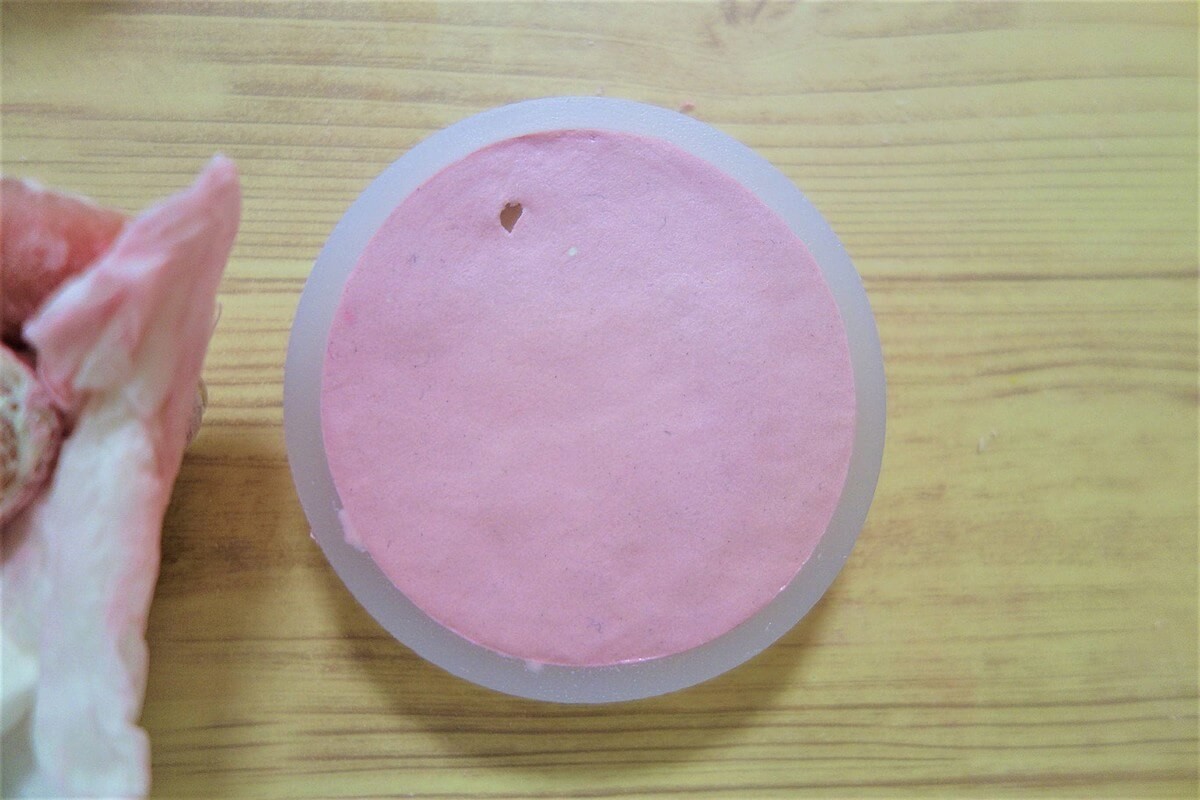 余分なねんどは手でちぎり、濡れた布やテッシュで水平にならして少し時間を置きます。 表面が乾いてきたら、シリコンモールドからねんどを取り出して大丈夫です。