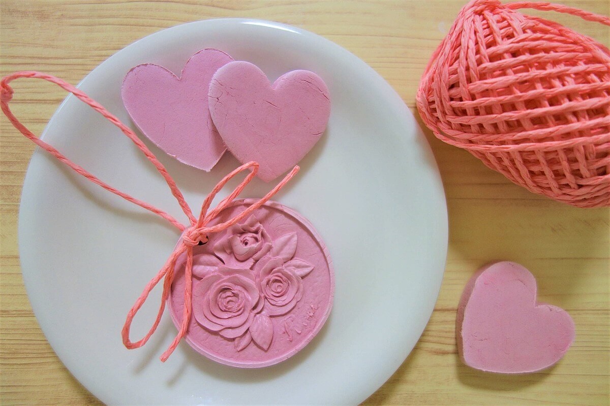 ねんどが完全に乾いたら、穴にラッピング紐やリボンを通してデコレーションすればアロマストーンの完成です。