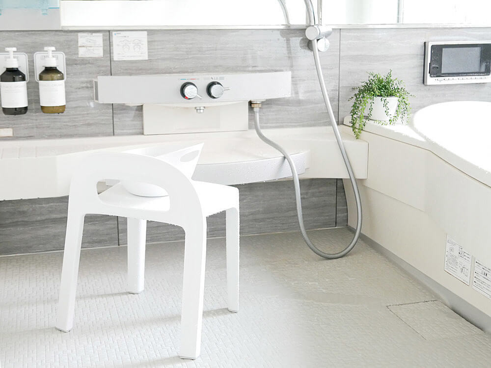 バスチェアと湯手おけのデザインを統一させることで、高級ホテル風なバスルームを演出できます。