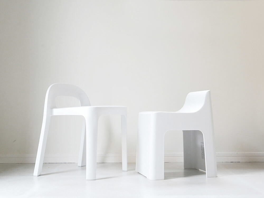 4脚で風通しが良くお手入れも簡単なAラインチェアと、コンパクトでスタイリッシュなスクエア形のハイチェア。