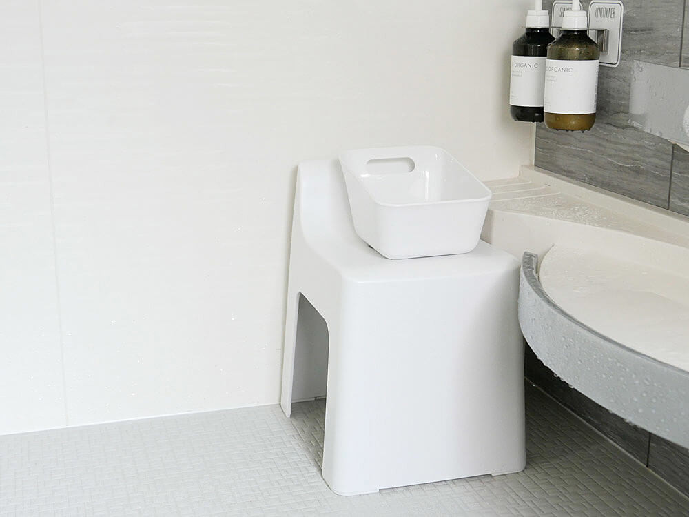ハイチェア&湯手おけ(角)はコンパクトなスクエア形状なので、バスルームのコーナーにすっきりと収まるのが嬉しいポイント。