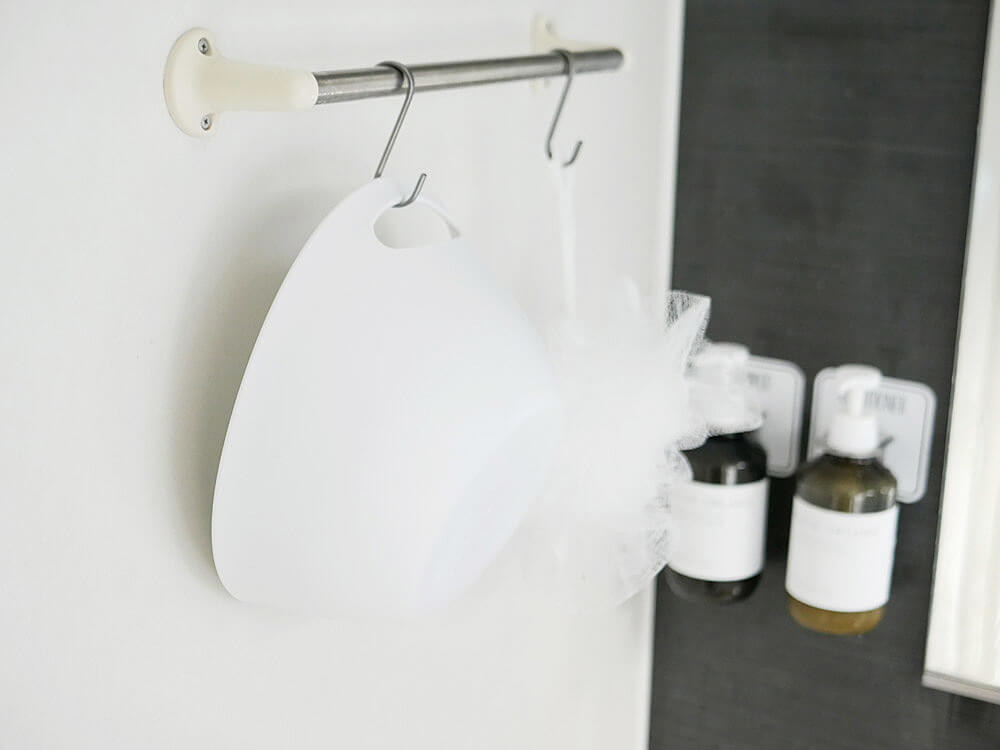 使用後乾燥させる時にも、底面を濡れた床につけることなくバスタブの側面に掛けられるのでとっても清潔です。 また、床をお掃除するときも邪魔にならないのが嬉しいポイントですね。