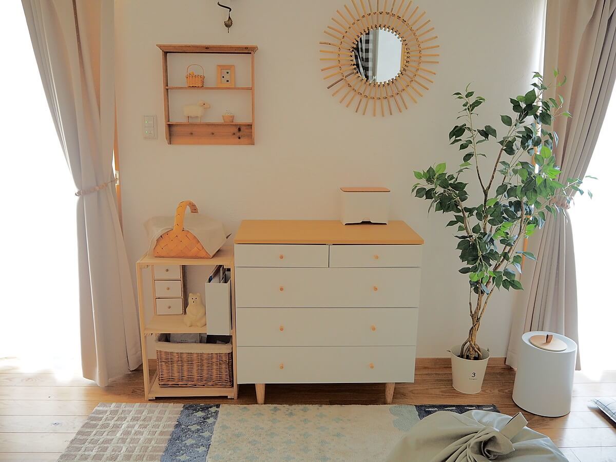 洋服は数をある程度絞って持つようにしているので、チェストに入る量でオールシーズンの服を収納しています(シワになりやすいスカートなどはハンガー収納してますが)。