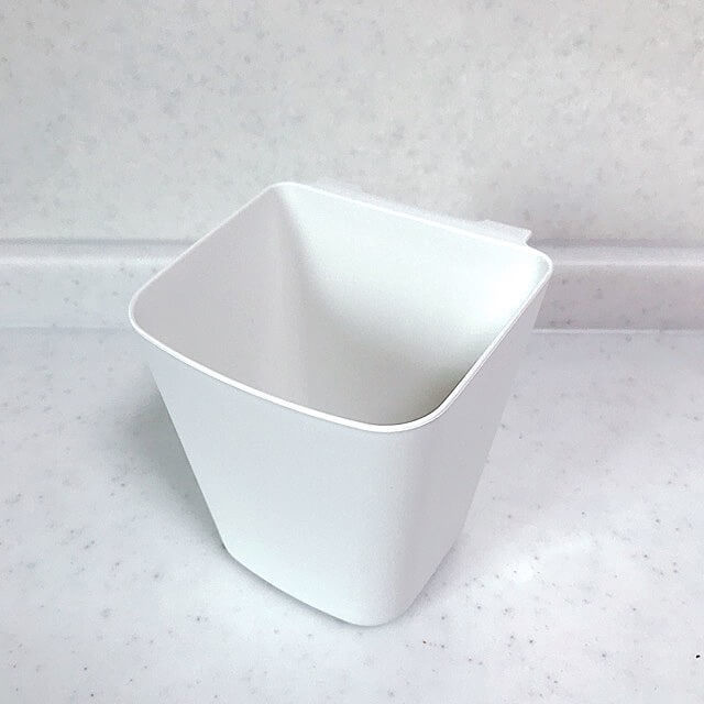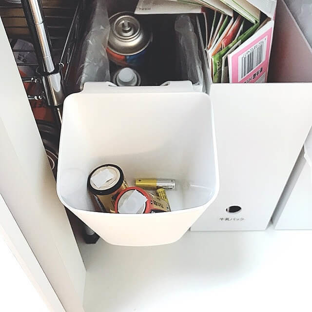 資源ごみのごみ箱にしているボックスの外側に引っ掛けていますよ。 ビニール袋に入れておくのより、口が開いているこういう小物入れのほうが入れやすいですね!