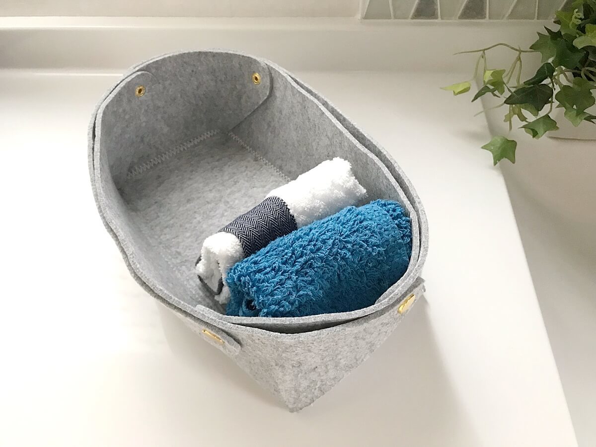 自然素材のラタンボックスなどに布製品を入れると、繊維が引っかかってしまうこともありますが、柔らかいフェルト素材ならそんな心配もありません。