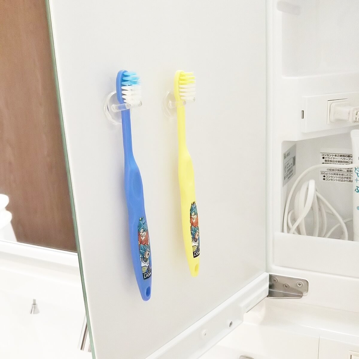 子ども用の歯ブラシ収納にも使用。大人は高い位置で子ども用は手の届く扉の裏に。