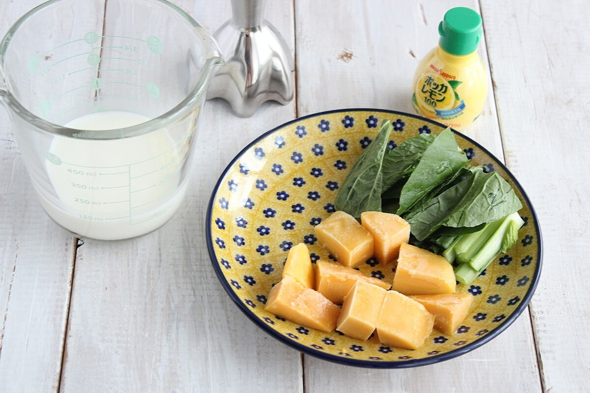 ① マンゴーは一口大にカットし、小松菜は3センチ幅くらいに切る。