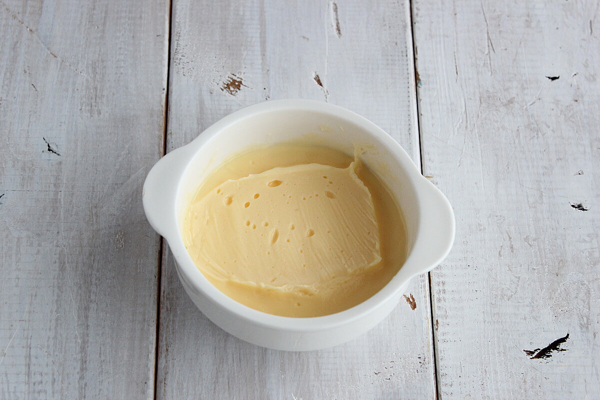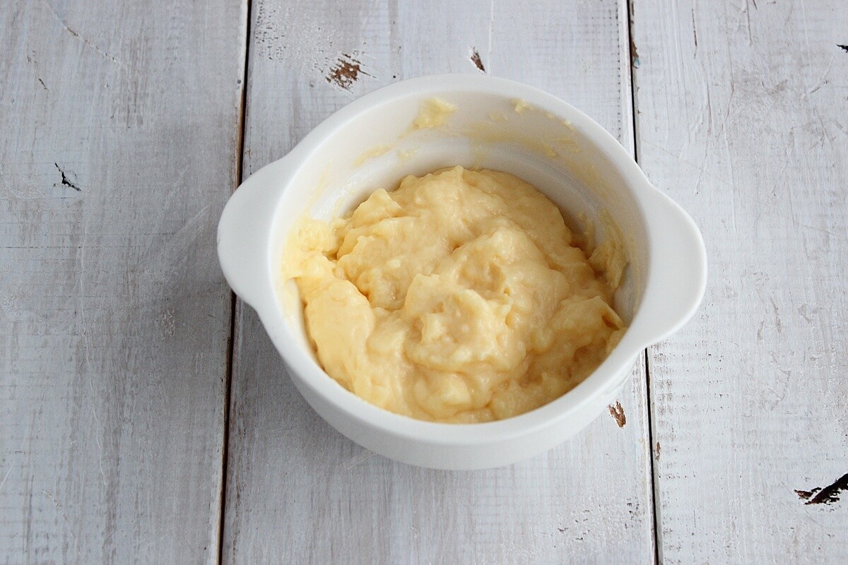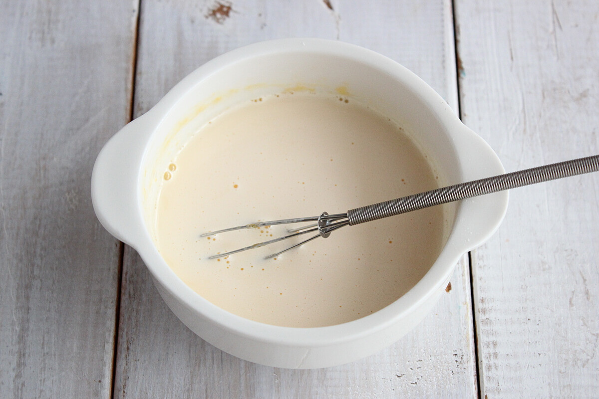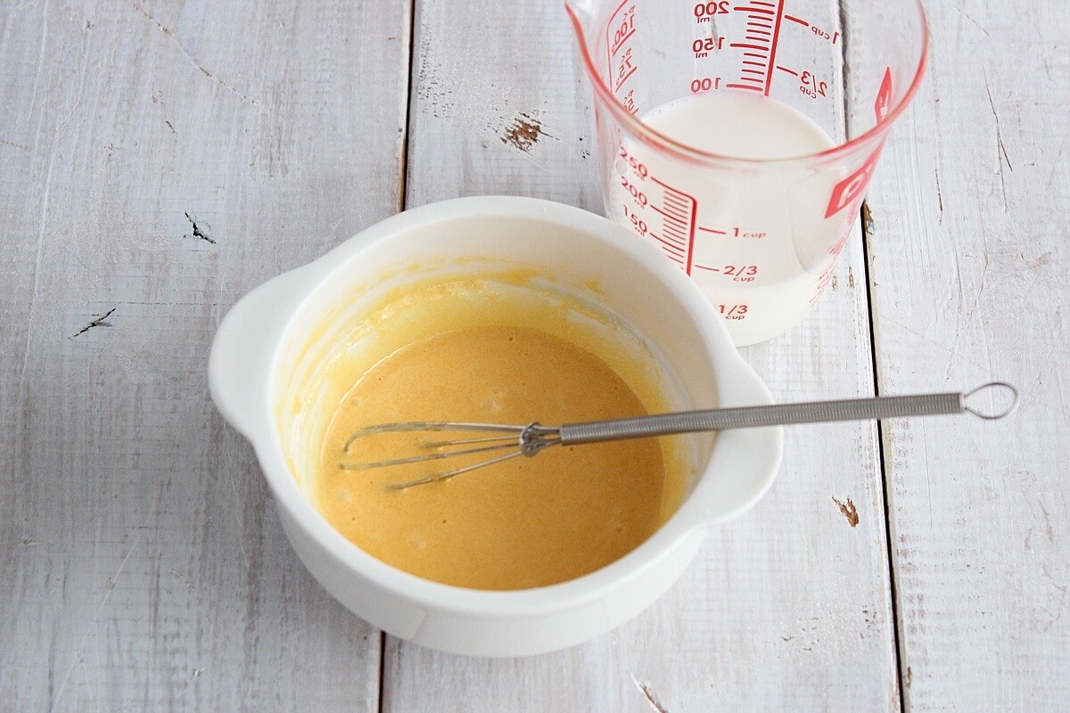 ② ①に牛乳をゆっくりと混ぜながら入れ、電子レンジの600Wで1分加熱する。一度取り出し良く混ぜる。