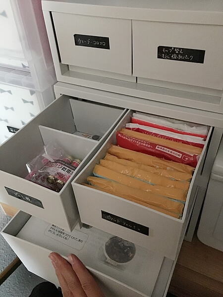 使用しているのは無印のPPストッカー。ざっくりとグループ分けして収納したことで、中身が見やすくスッキリしていますね。想像以上の収納力に驚きです!