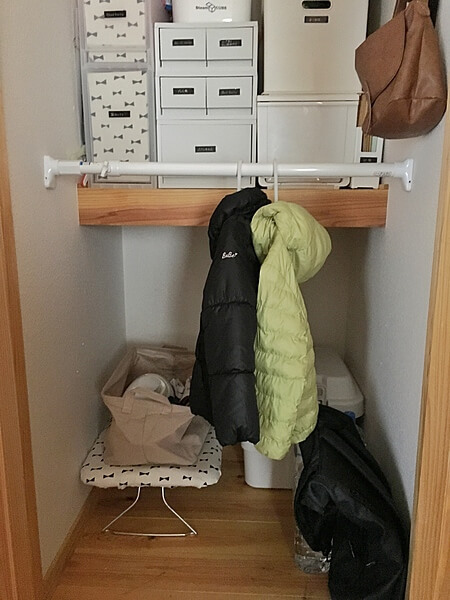ここは、リビングにある唯一の扉付き収納ということで……。 子どもたちの上着類を収納して、自分たちで出したり片付けたりさせたいな〜と考えました。