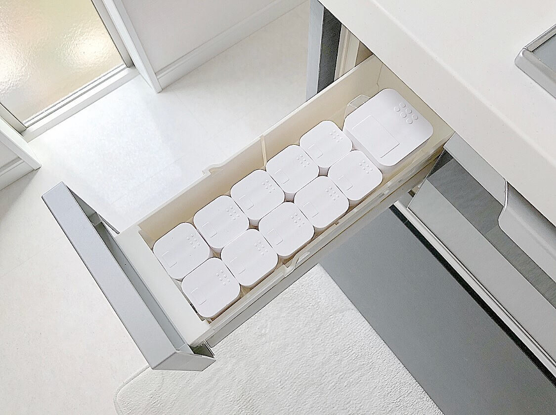 四角い形が納まり良く、スパイス用引き出しにもぴったりサイズです。