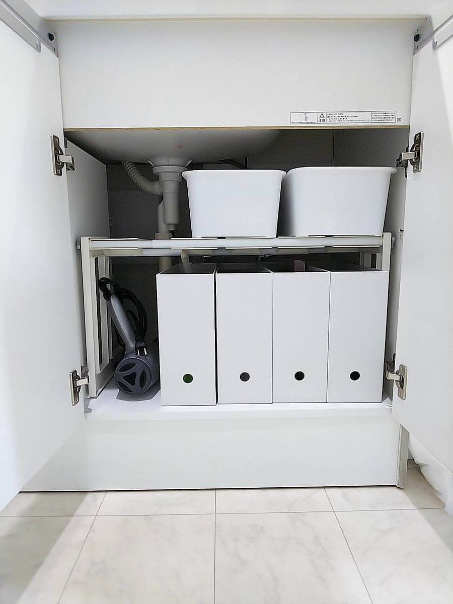 配水管を避けて設置できるのも大きなポイント。洗面台下の空間が広く使え収納しやすくなりました♪