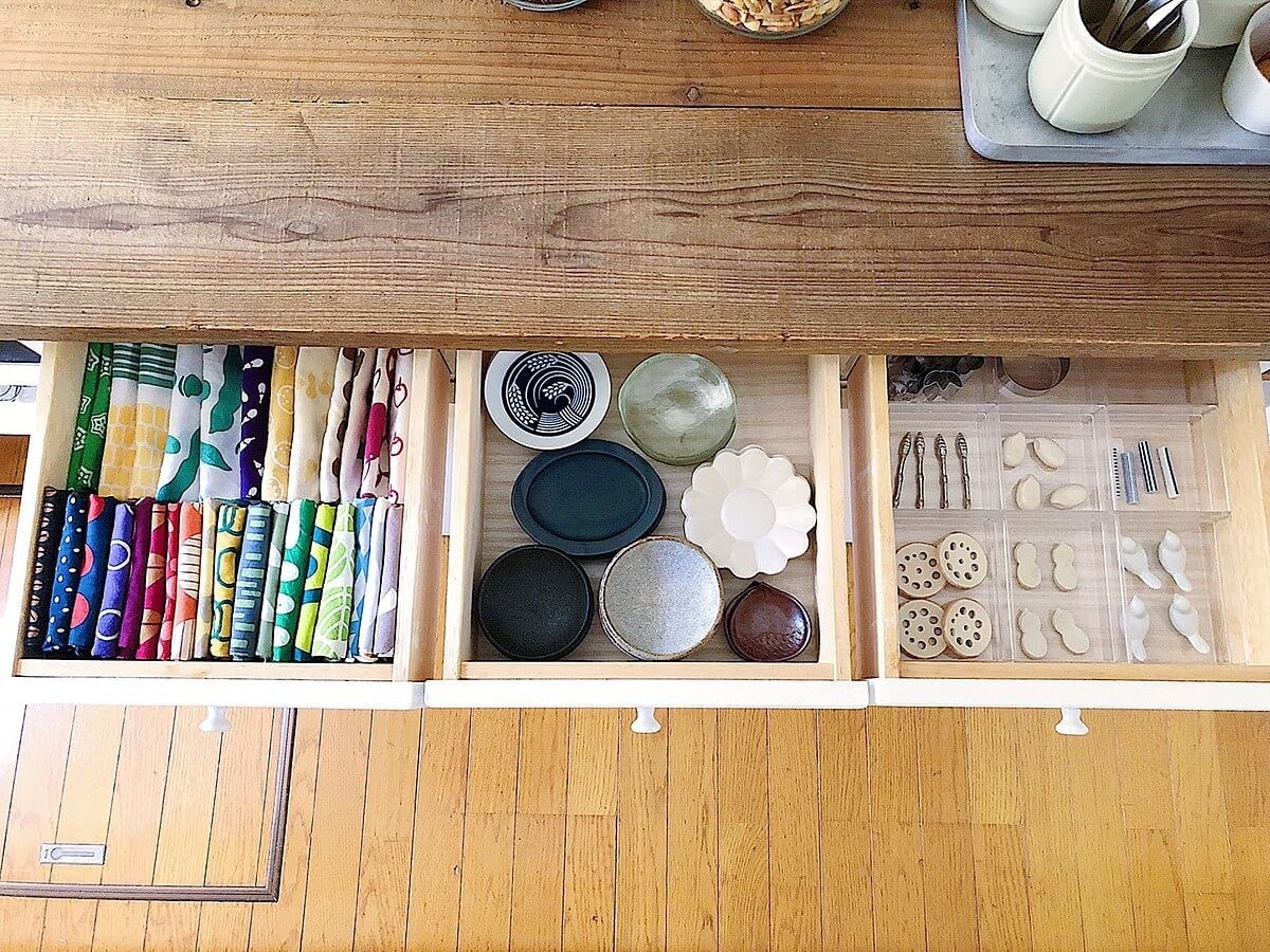 食器棚の引き出しは、いろんな柄のお弁当包み、豆皿 、箸置きを収納しています。取り出しやすくしまいやすくするために、色別に分けたり、仕切りを使っています。