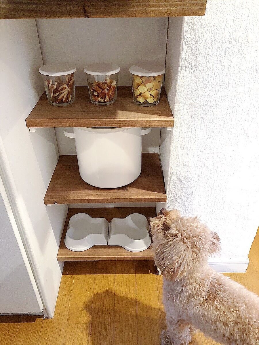 食器棚を壁から少しずらして開けたスペースに、わんこの食事スペースもあります。ここも色は白です。