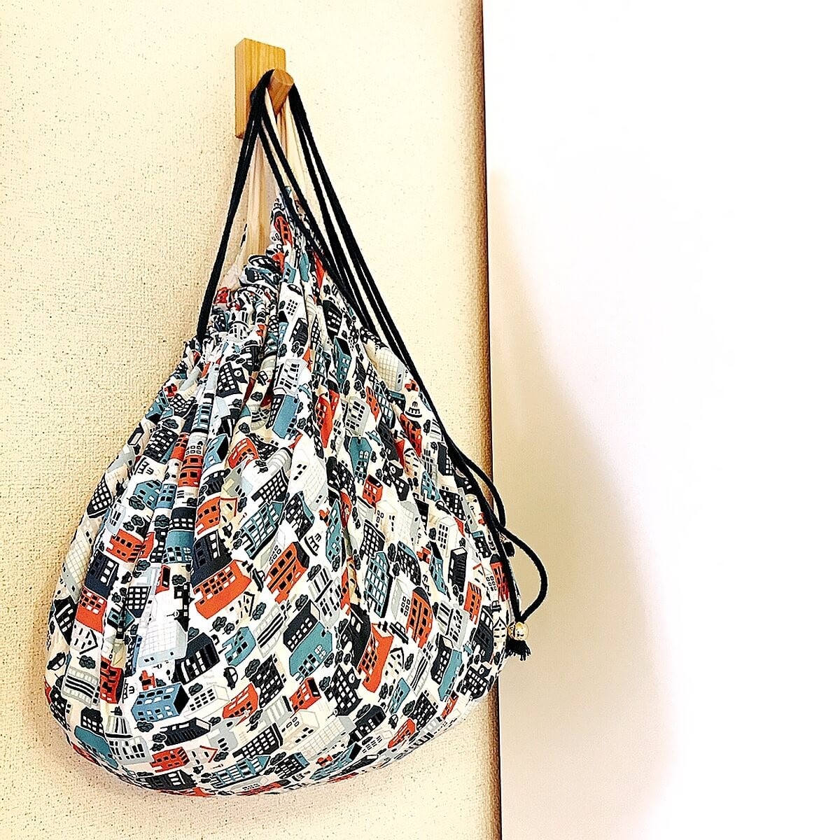 遊び終わったら、紐をもってキューっと引っ張ると、巾着袋のようにレゴを瞬時でお片付けできます!