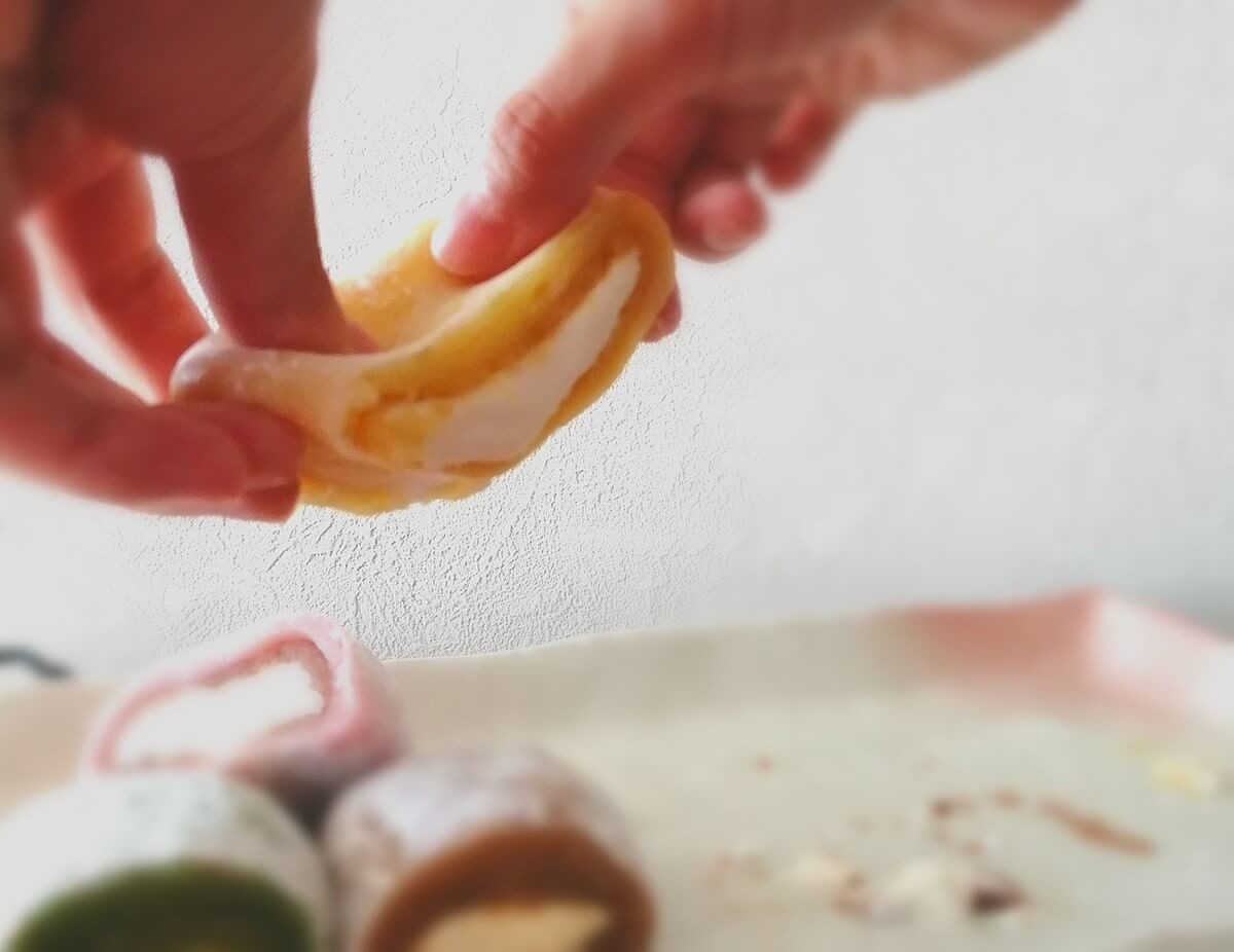 最初はカチカチだった大福が、手に持つだけで「びよ〜ん」と伸びるほど柔らかくなりました! もっちもちの皮に包まれた生クリームと餡がおいしそうですね♪