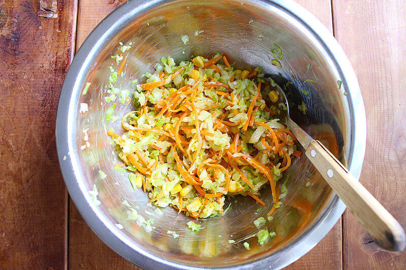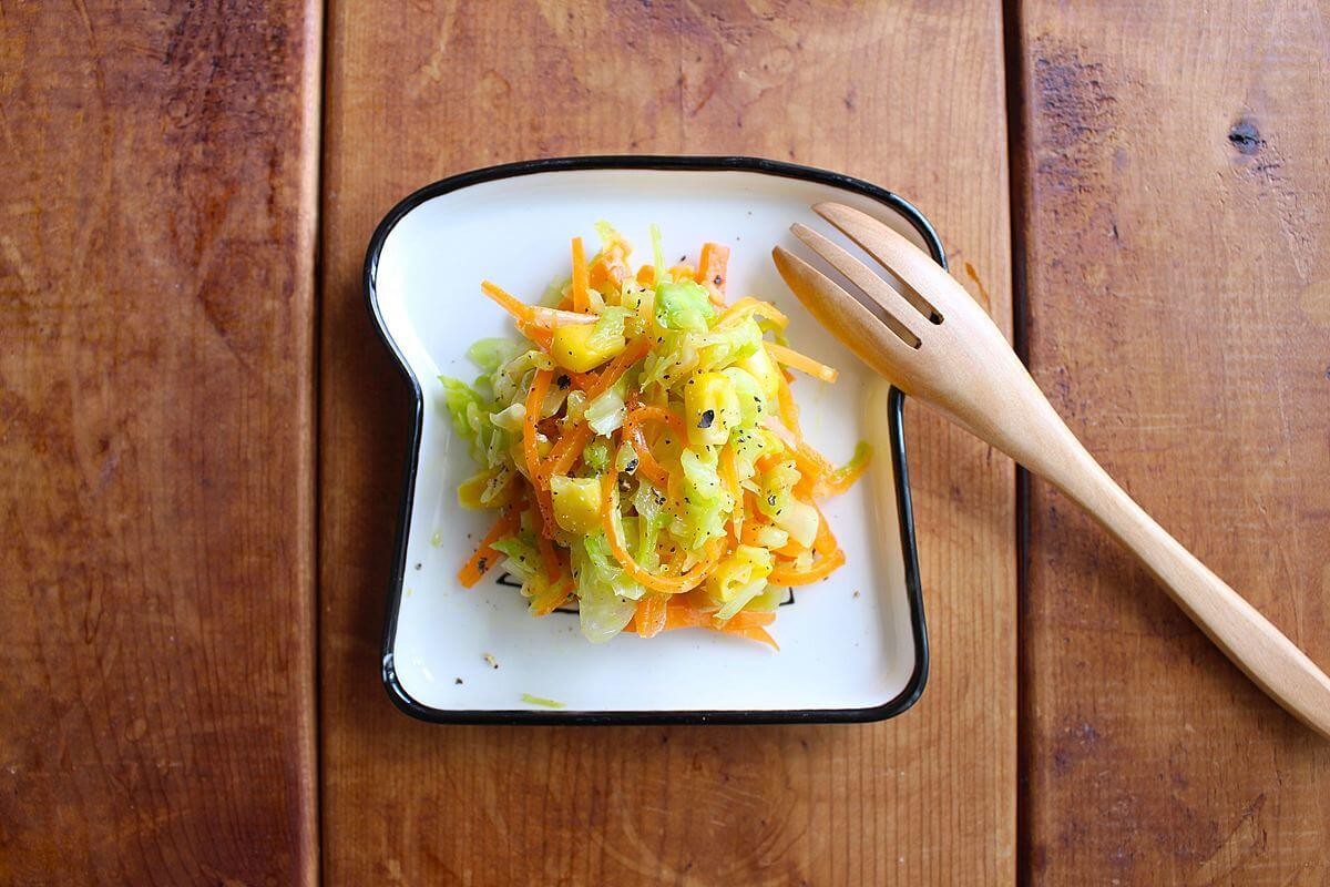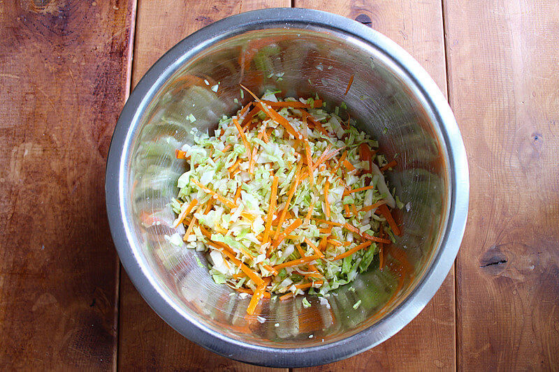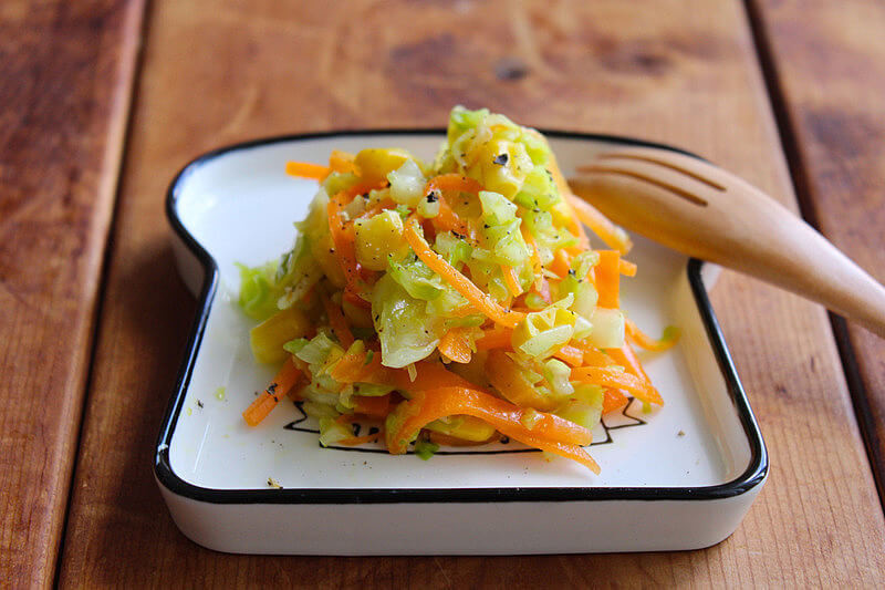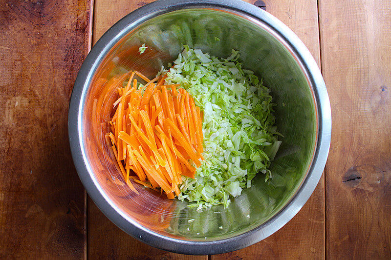 (1)大きめのみじん切りにしたキャベツと、千切りにしたにんじんに塩をまぶして混ぜ、水気をしっかりしぼります。