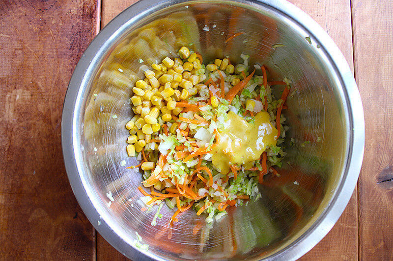 (2)(1)にコーンとクミンドレッシングを加えて混ぜます。