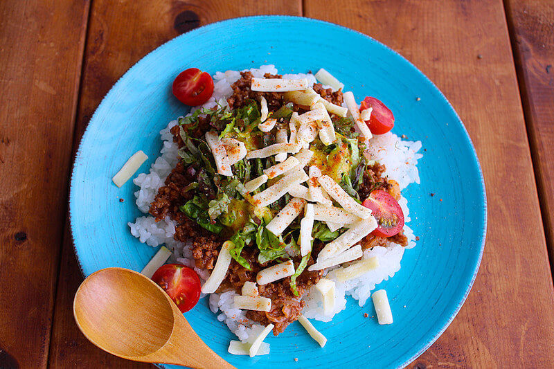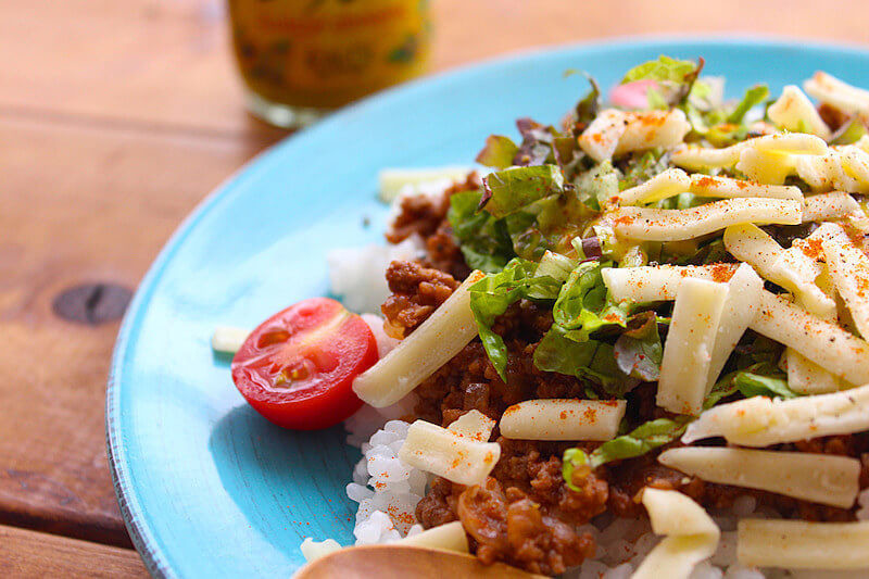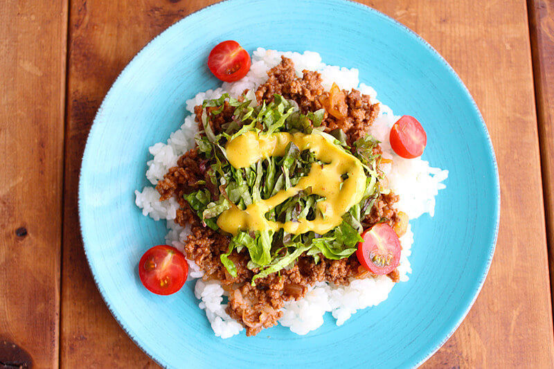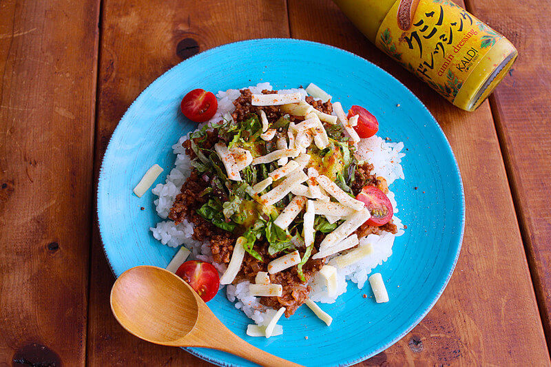 クミンドレッシングをかけるだけで、いつもよりワンランクアップ美味しいタコライスが、簡単にできあがりました♪