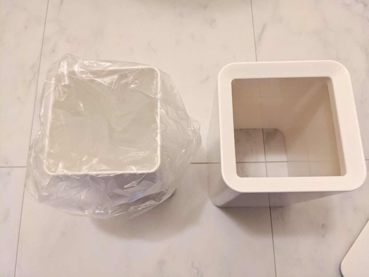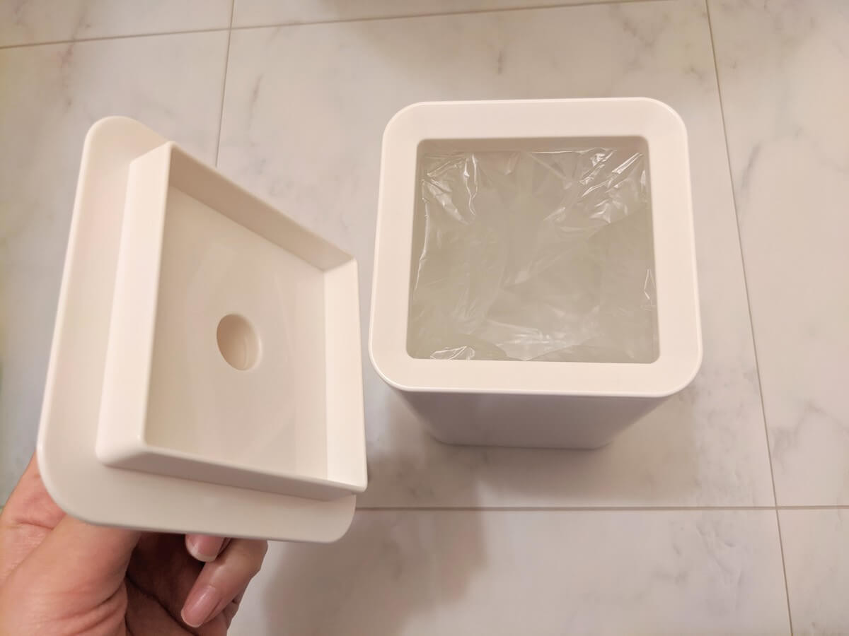 さらに、こちらのダストボックスは2重構造。中にセットした袋が見えにくい仕様となっています。トイレだけでなく、洗面所でも使用可能です。