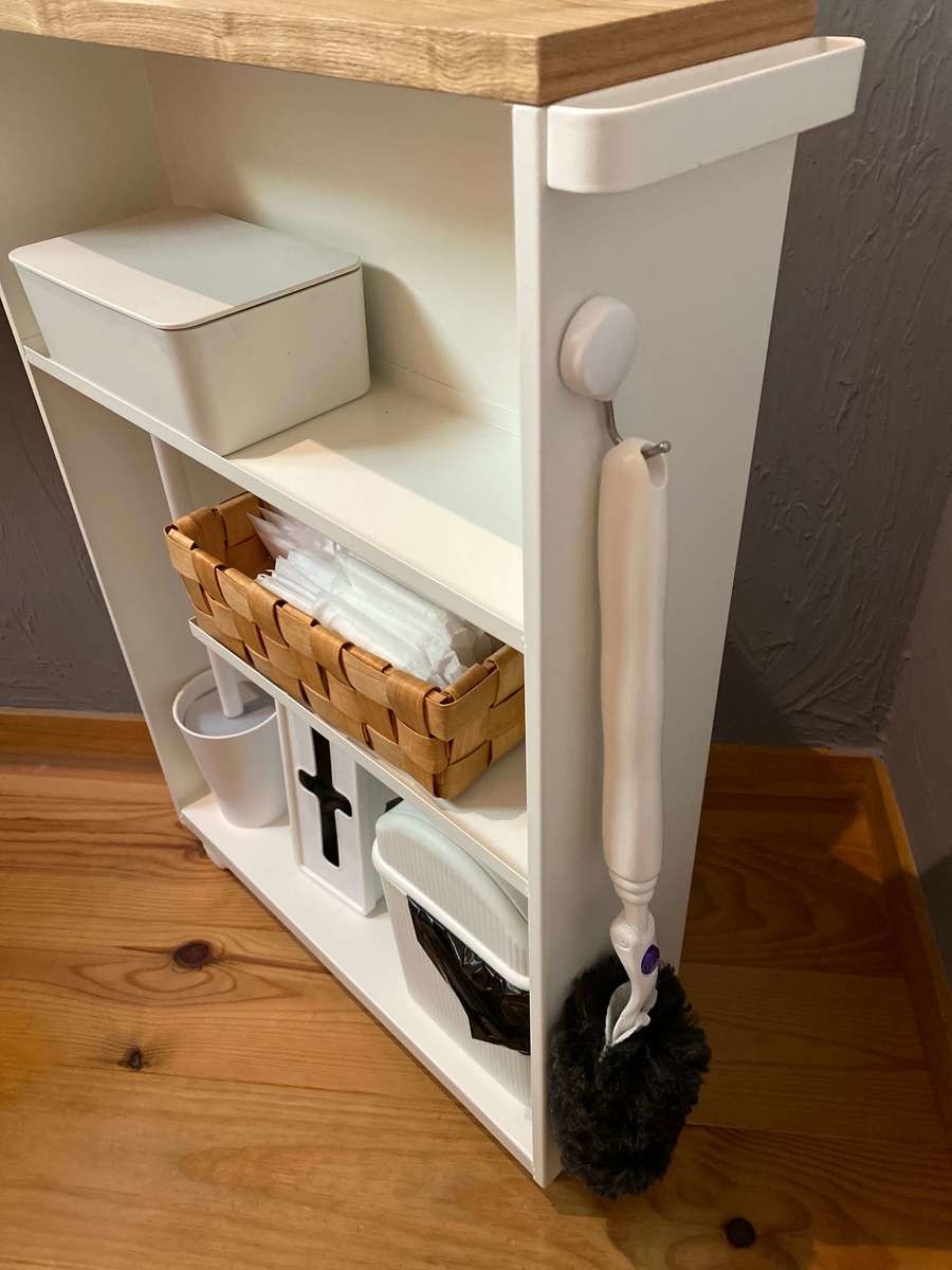 また、わずか14cmというスリムな幅で、トイレスペースが小さなお家にもぴったりです!トイレブラシやシートなども収納できるので、清潔感のあるトイレに仕上がりますね◎
