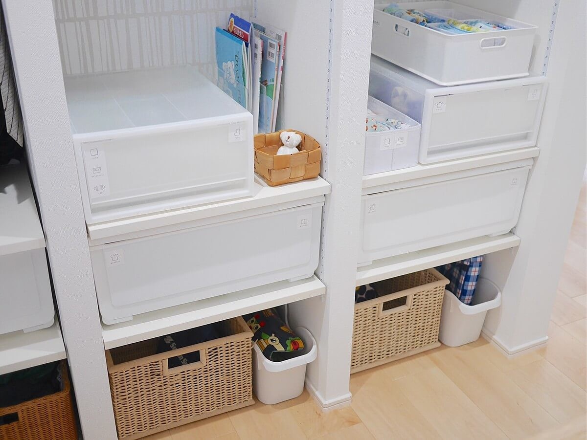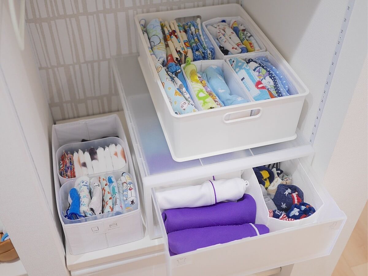 次男の方は、幼稚園の持ち物も多いので、無印良品のPP収納の中には靴下・体操服があり、横のスペースにはハンカチ・ティッシュを入れています。