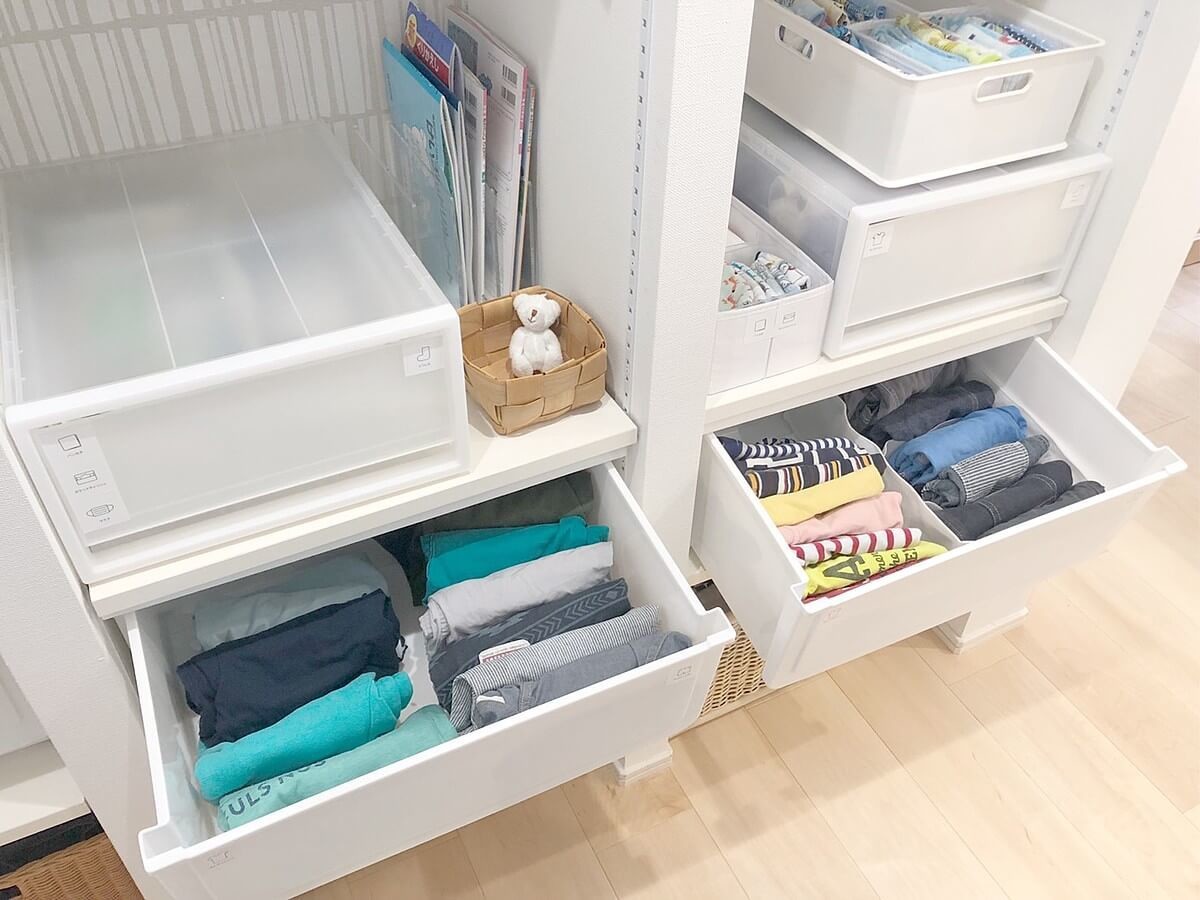 子どもの身長から、一番使いやすい高さの収納には、毎日着るお洋服のシャツとズボンを入れています。
