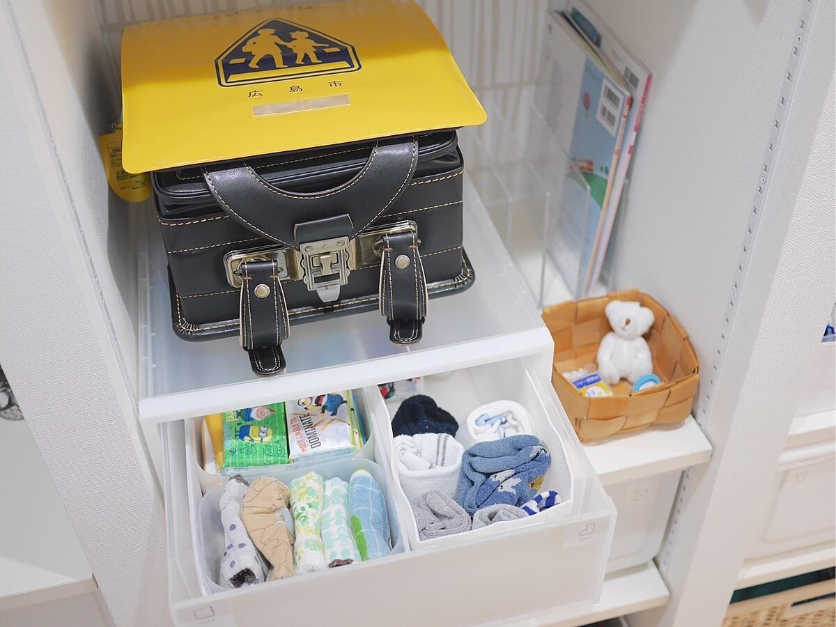 長男の方は、無印良品のPP収納の上にランドセルを置き、中には靴下・ハンカチ・ティッシュがあり、横のスペースには無印良品のブックスタンドに教科書を立てています。