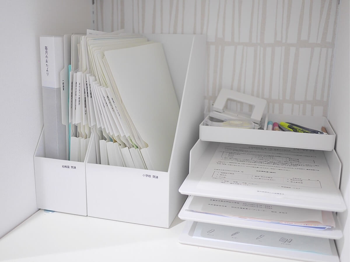 次男のロッカーの上には、幼稚園や小学校からもって帰ってくるプリント類の収納です。 必要な文房具も一セットを作り、こちらに置いているので、アンケートなどはその場で書いたりハンコを押して、お便り袋にすぐに入れるようにしています。