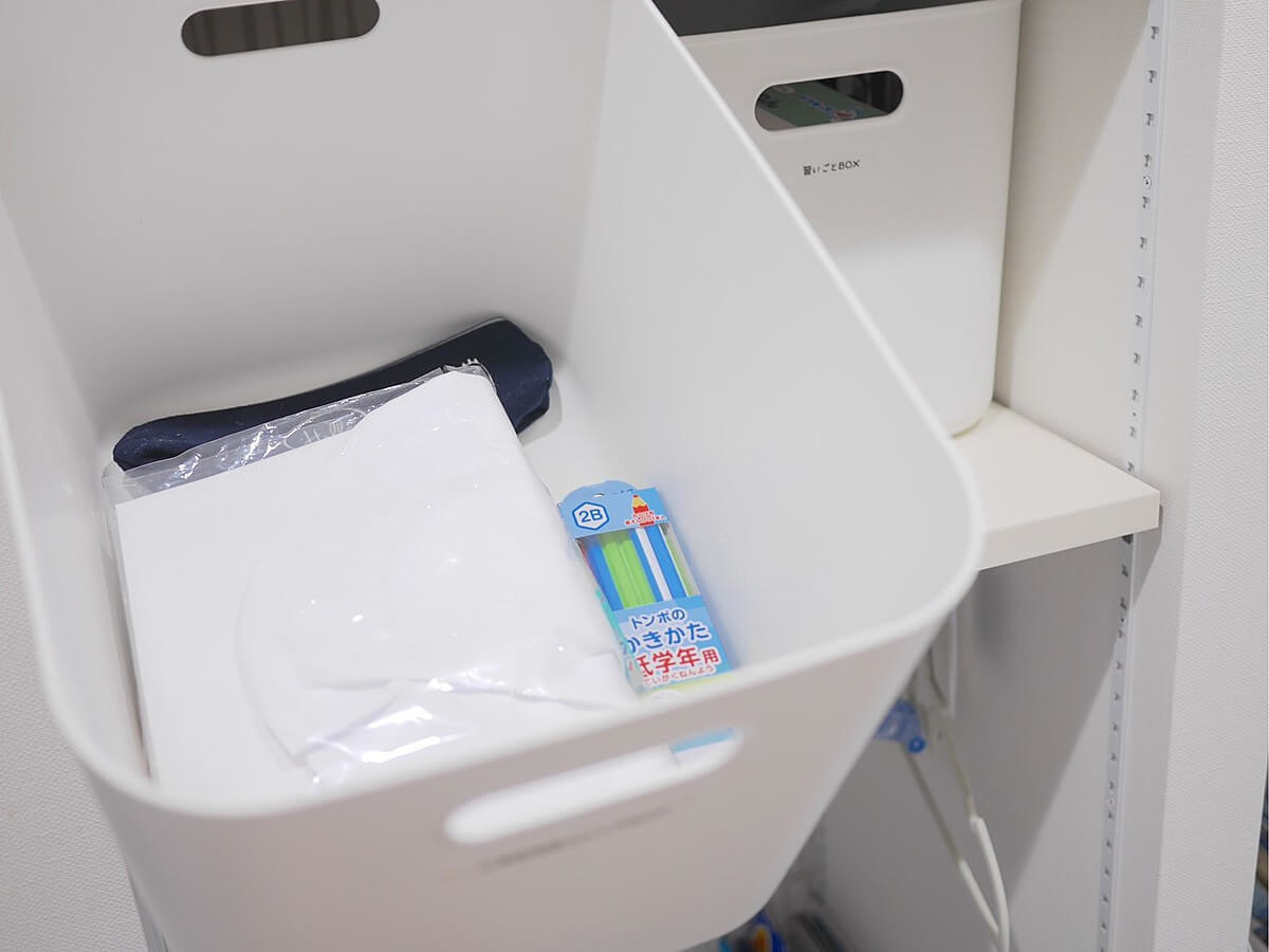 長男の上の方には、学用品(えんぴつやノートなど)のストックや次男の習い事の教材を入れています。