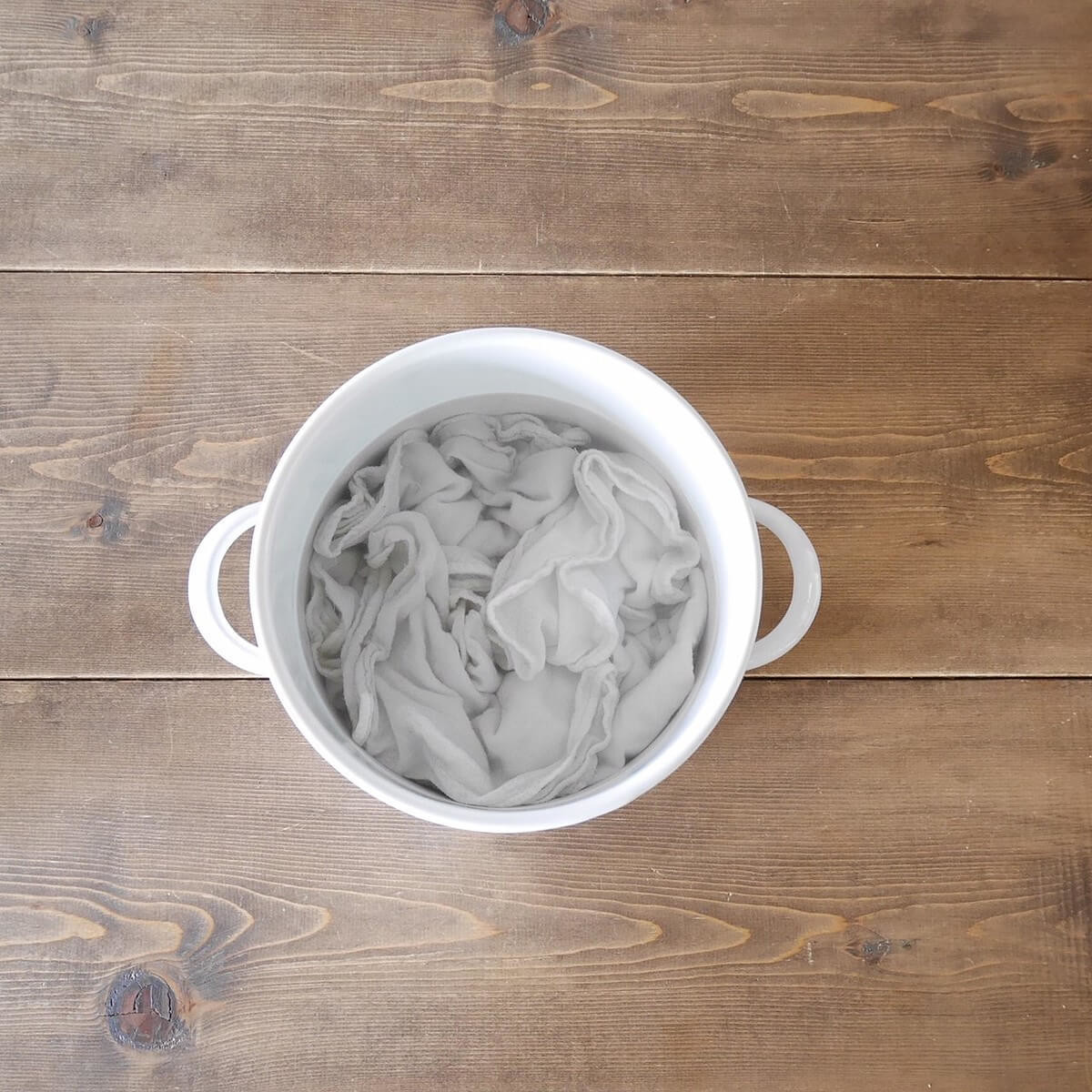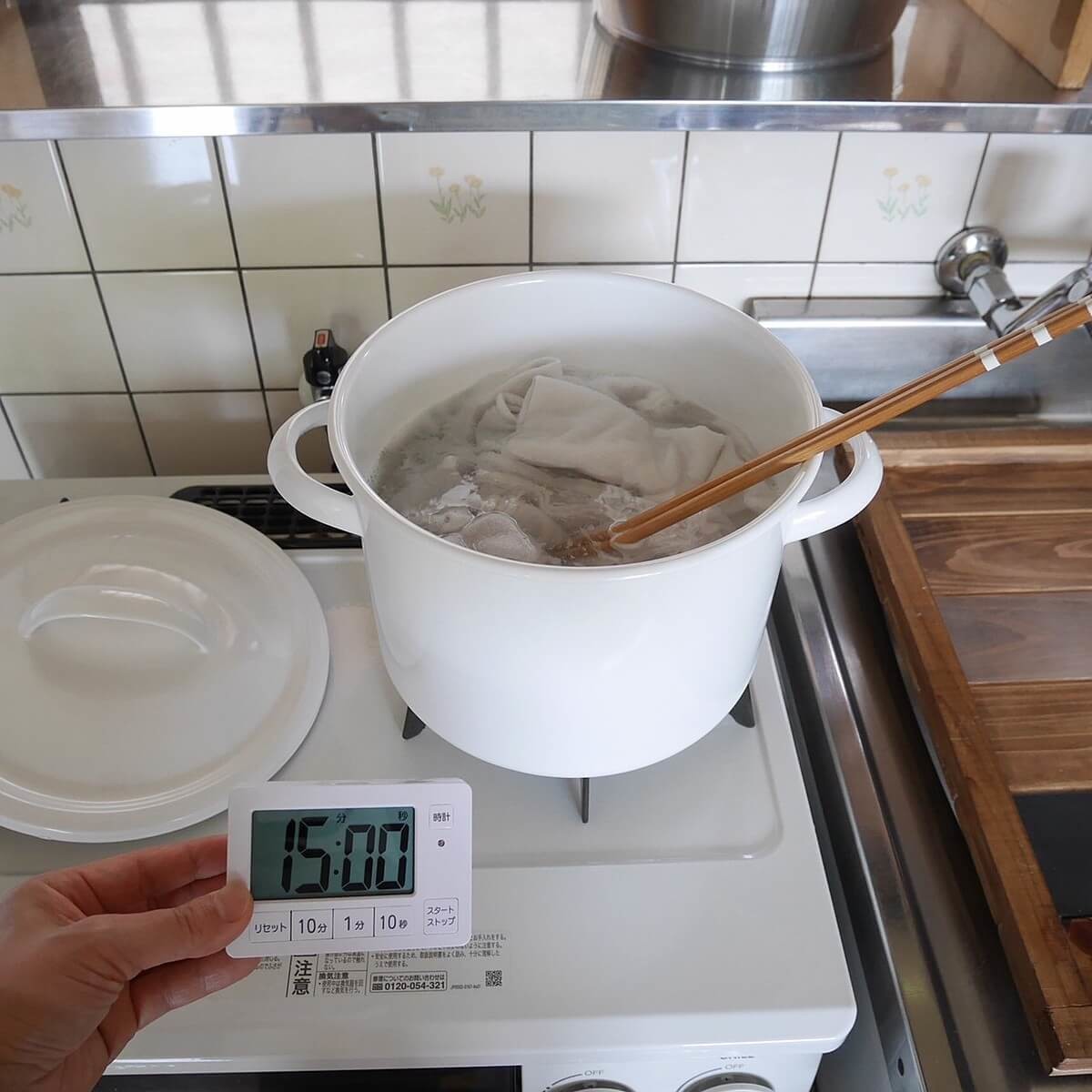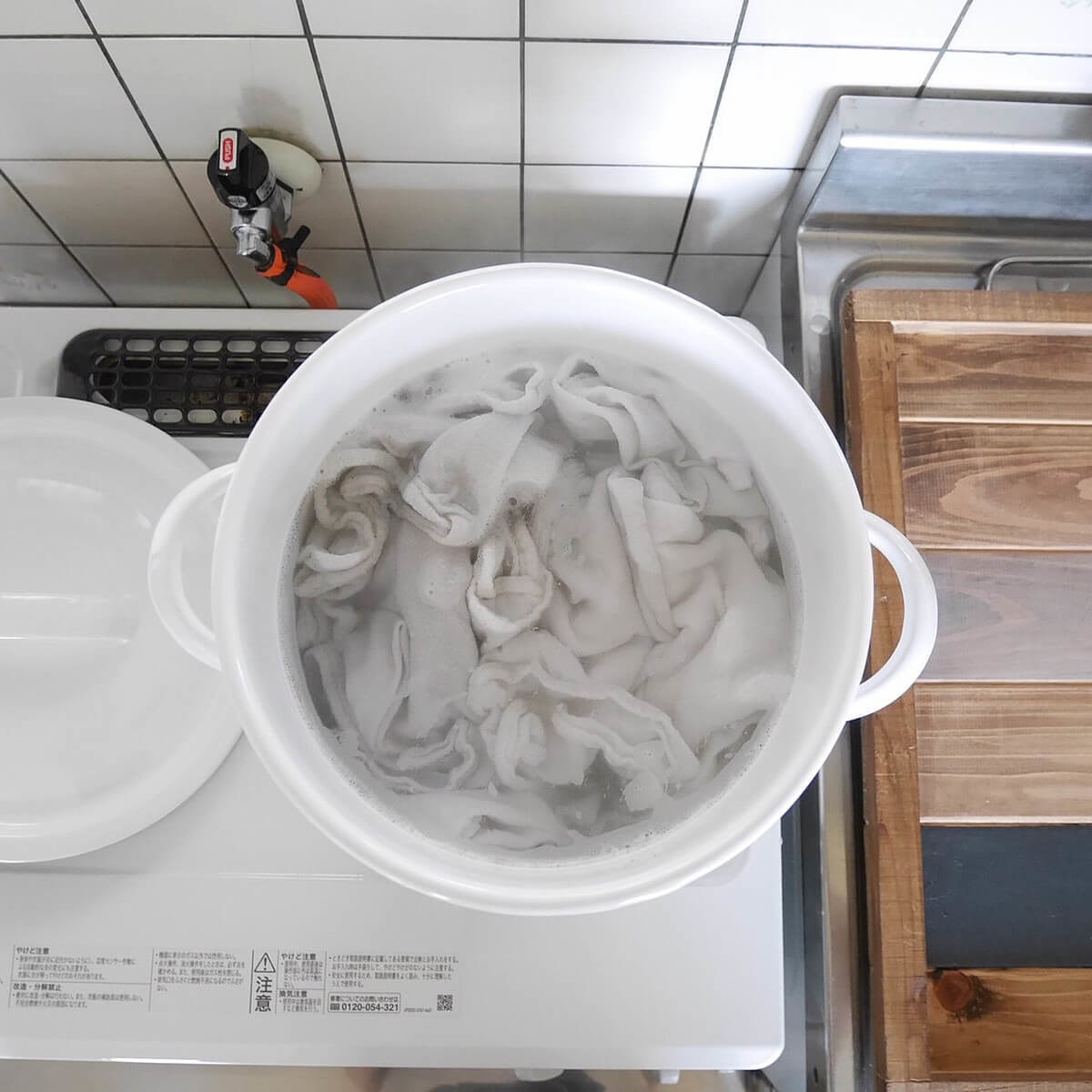 お鍋に布巾が全て浸かるくらい、たっぷりのお湯を沸かします。