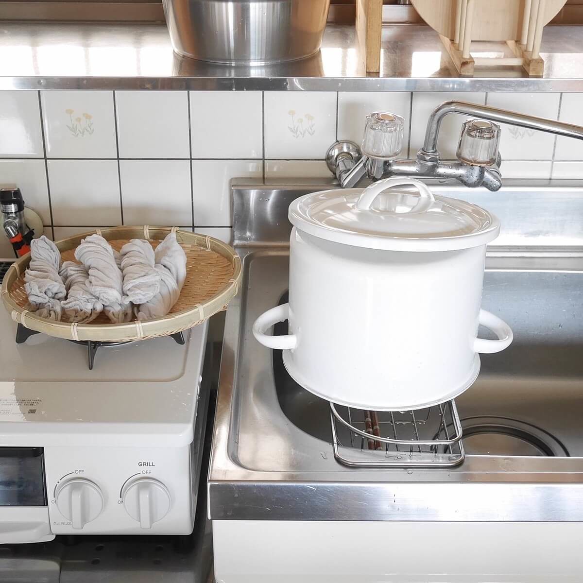 重曹の代わりにセスキ炭酸ソーダを使うのも良いですし、お鍋を使うのに抵抗がある方は、直火にかけられる煮洗い専用の琺瑯のバケツなどを用意すると良いですね。