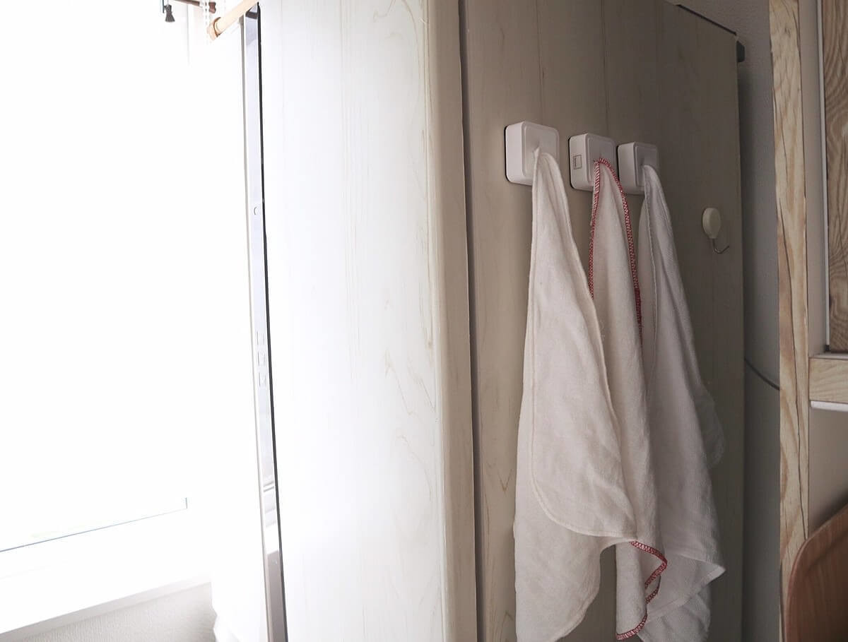 タオルホルダーがコンパクトになったことで、冷蔵庫の横の空間を利用してスッキリきれいに収納でき見た目も良くなりました!