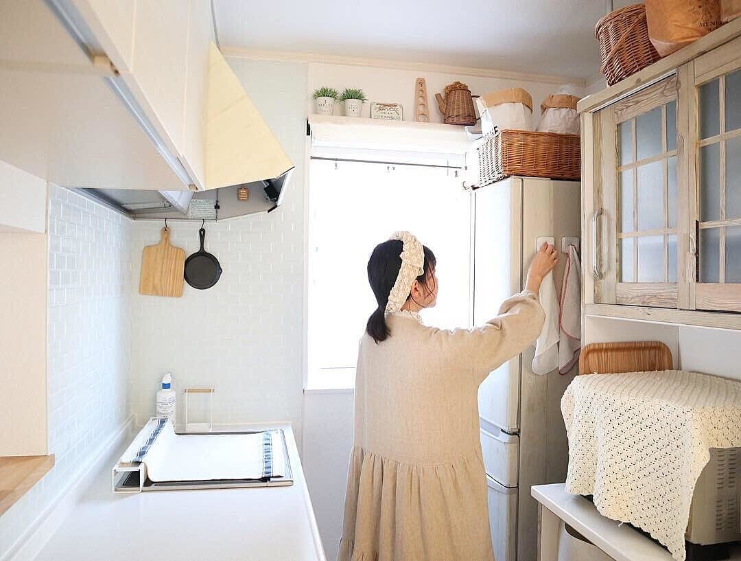 空間をうまく利用して浮かせる収納にすることで、キッチンがすっきりします。コンパクトなタオルホルダーなので、空いた空間に収納してもスッキリですよね。