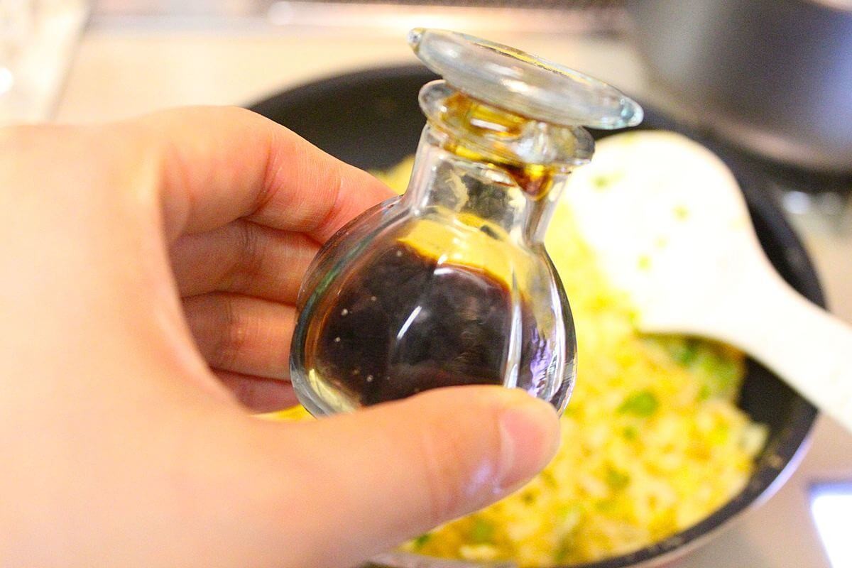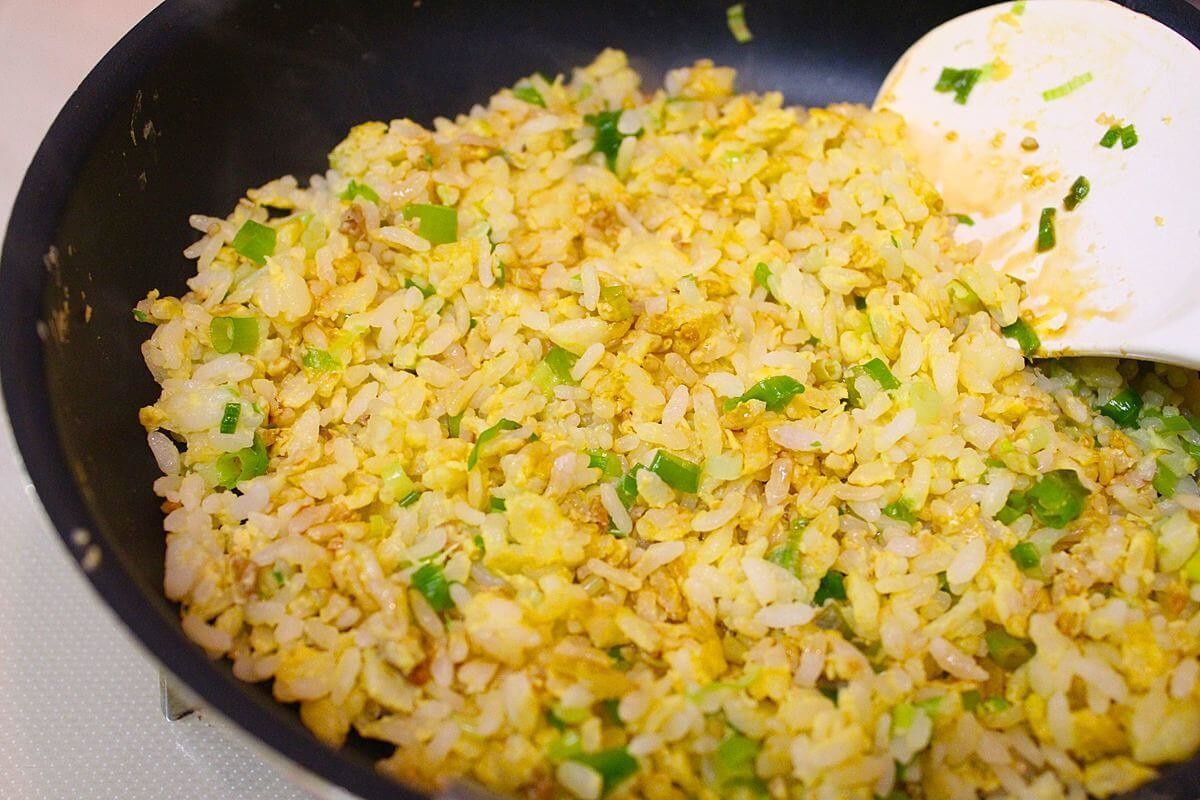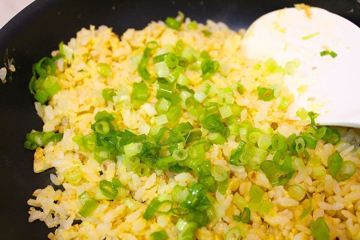 (3)パラパラになったらネギを入れて、全体が混ざったら醤油を垂らし、さらに混ぜて完成!