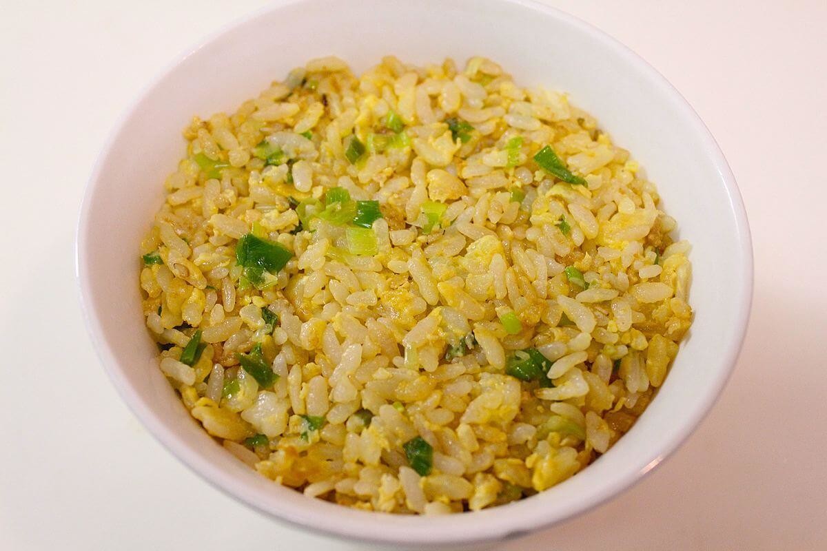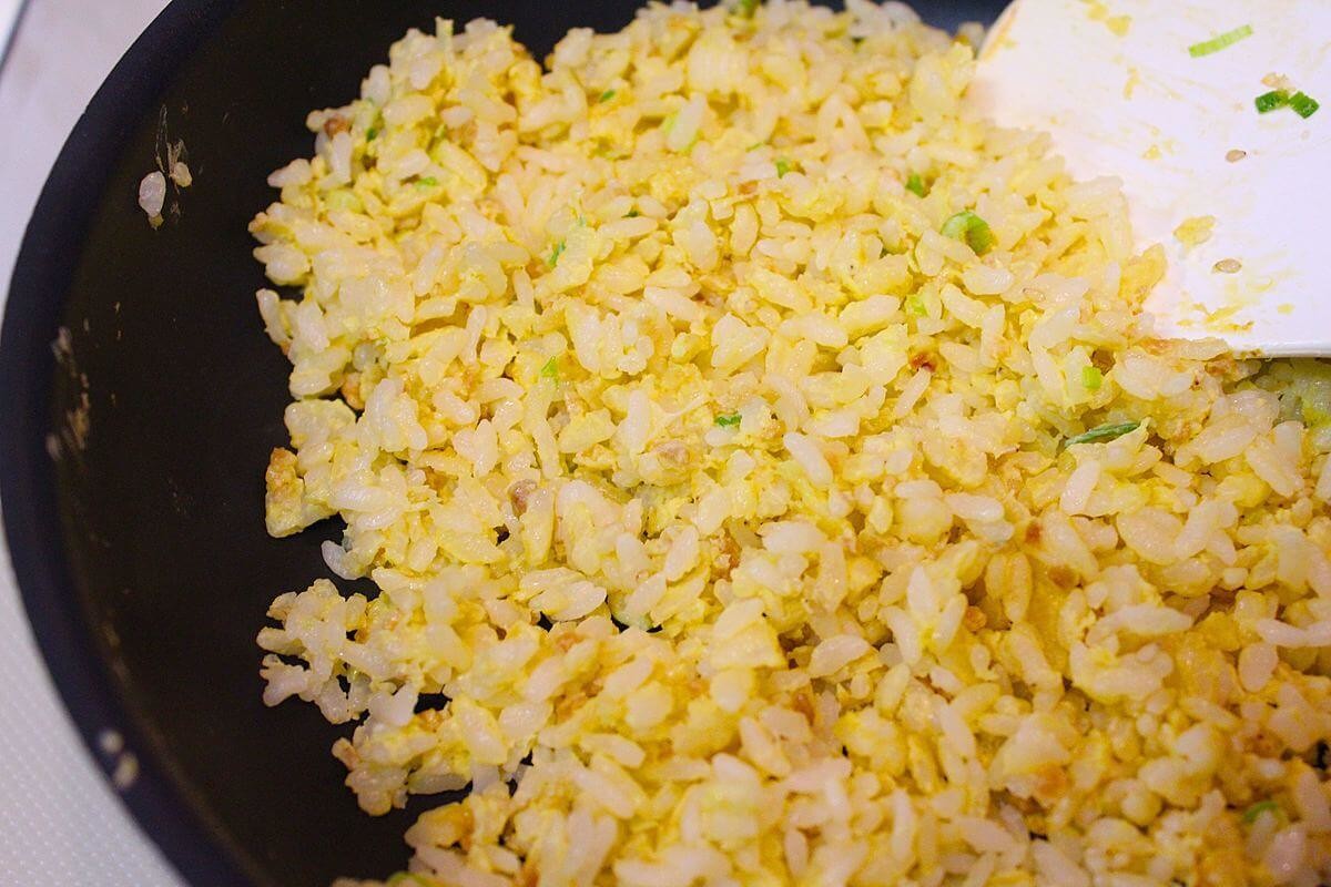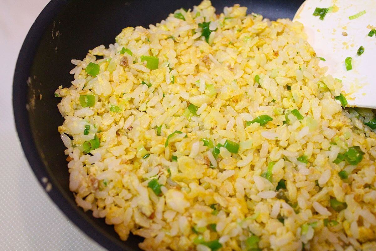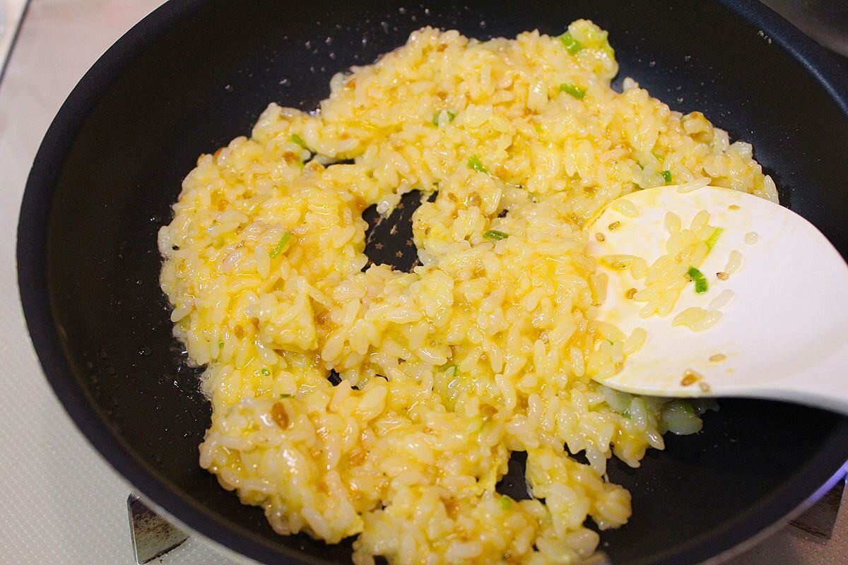 (3)パラパラになったらネギを入れて、全体が混ざったら醤油を垂らし、さらに混ぜて完成!