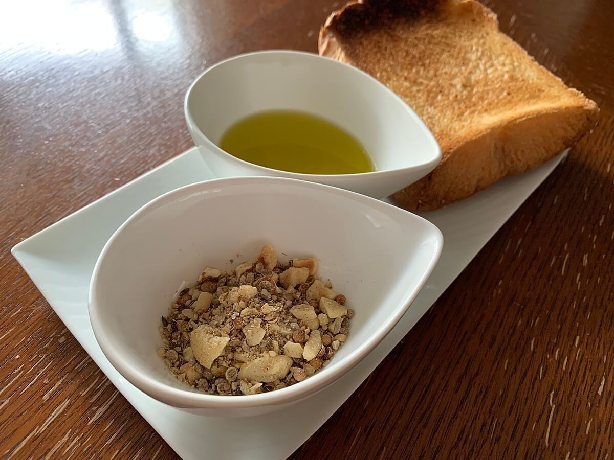 ナッツやスパイスを余すことなくいただきたかったので、オリーブオイルとデュカを小皿に入れて、ダブル付けするスタイルに。まずちぎったパンをオリーブオイルにディップし、その後ディップした部分をデュカにつけて食べてみました。