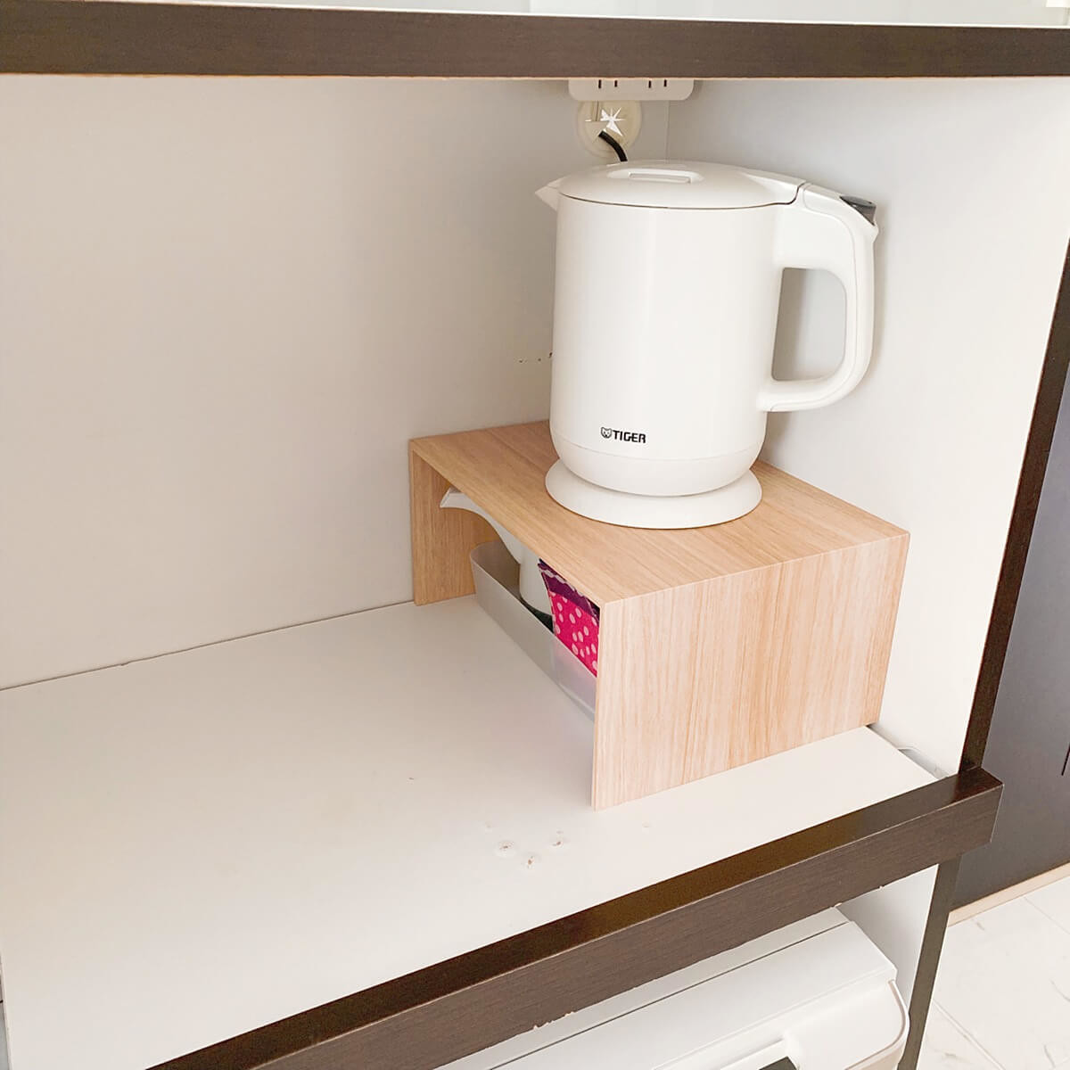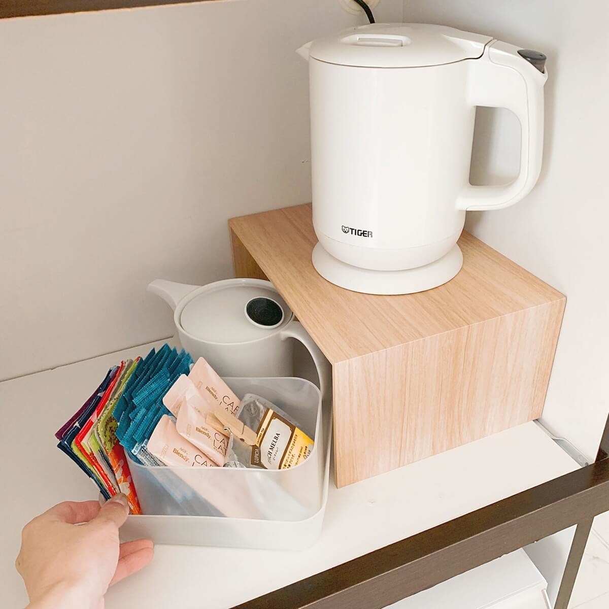 上段には電気ケトル、下段にインスタント珈琲やポットのセットを置いて空間を有効利用できます。