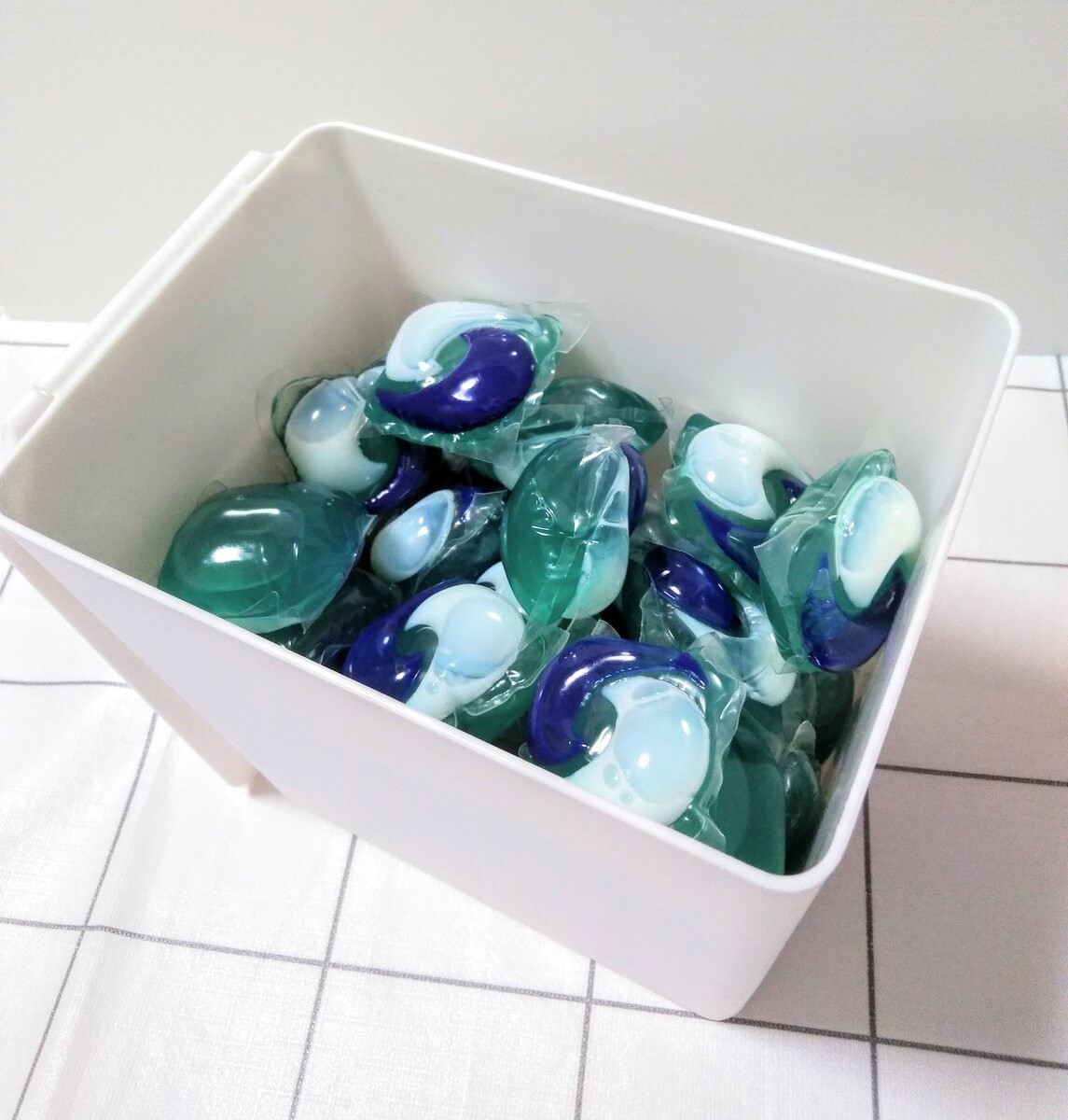 ジェルボール洗剤を収納する場合は、フタが一体型であるダイソーの「洗剤収納ケース」がおすすめですよ!