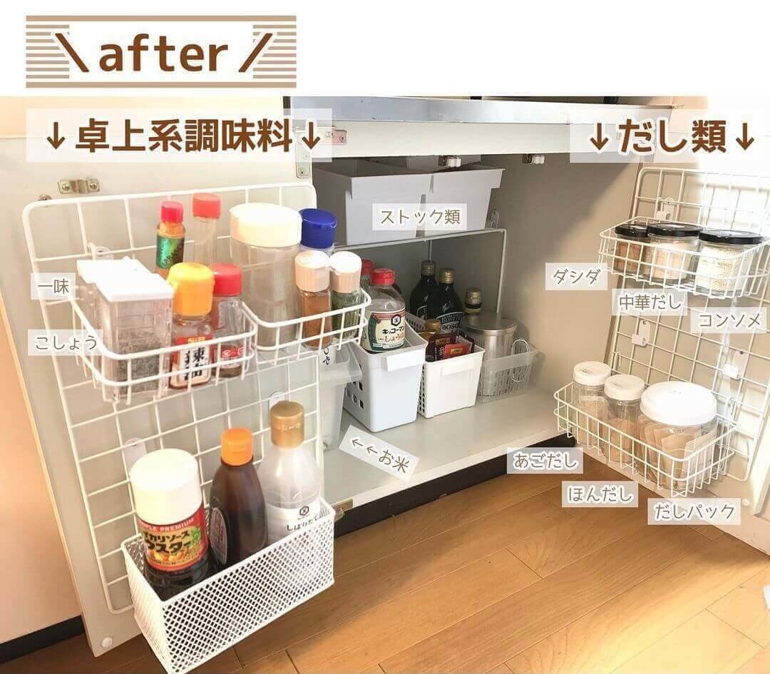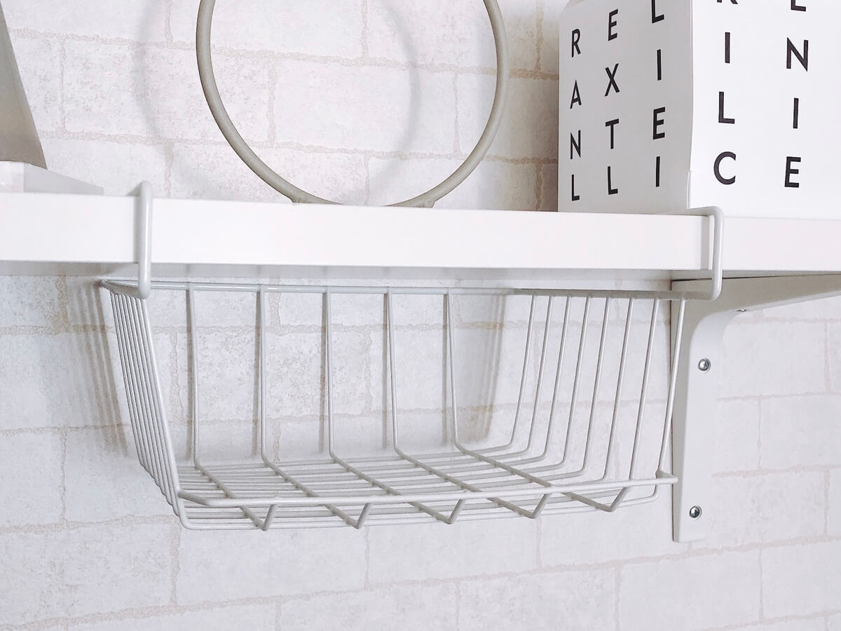 投稿者の@yume7570さんはワイヤーネット、ワイヤーネット吊り下げフック、ワイヤーラック(全てダイソー)を使って見事に収納スペースを増やしています。