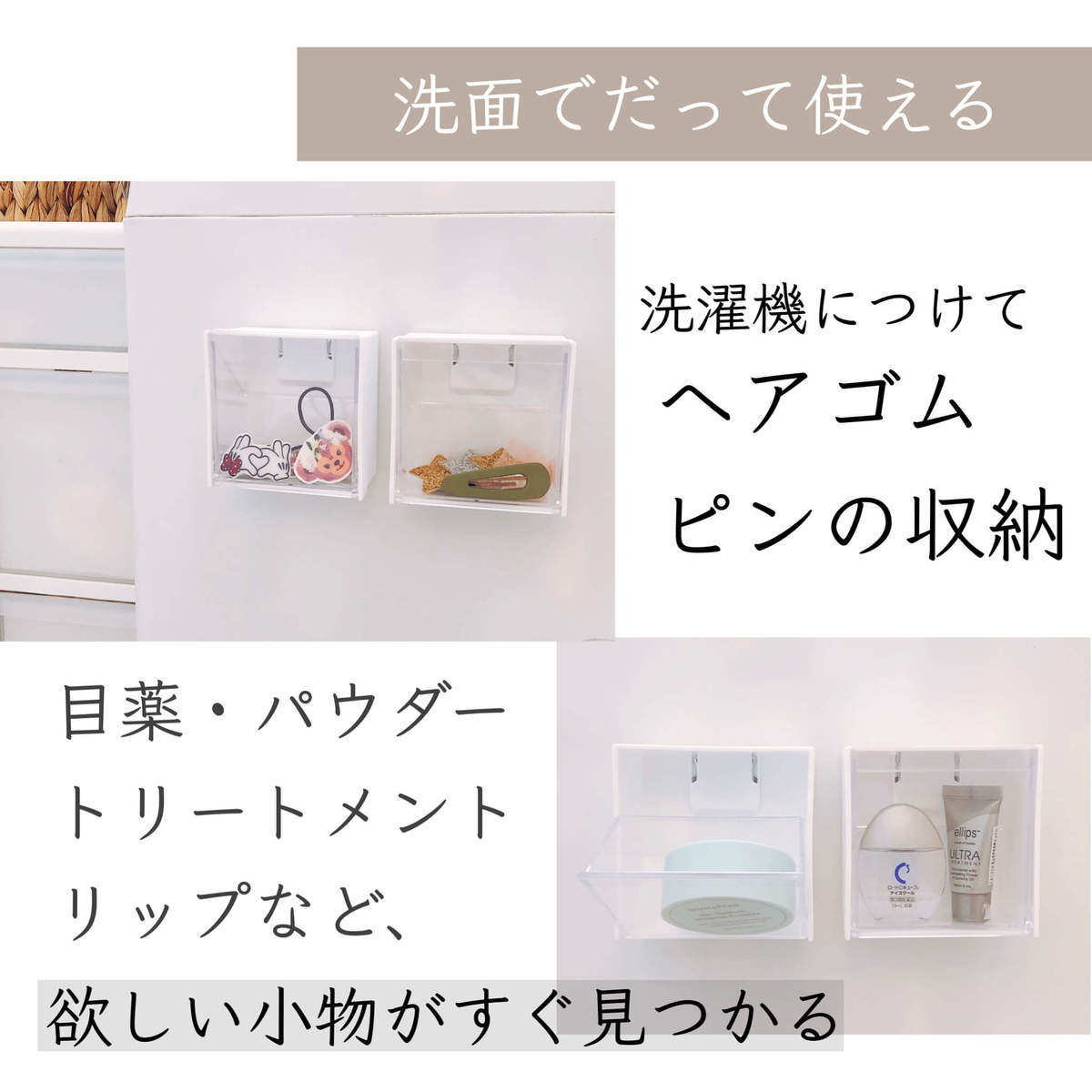 洗面台横の洗濯機につけ、ヘアピンやヘアゴム、目薬、パウダーやトリートメント、リップなどなどごちゃつきやすい小物を収納しています。